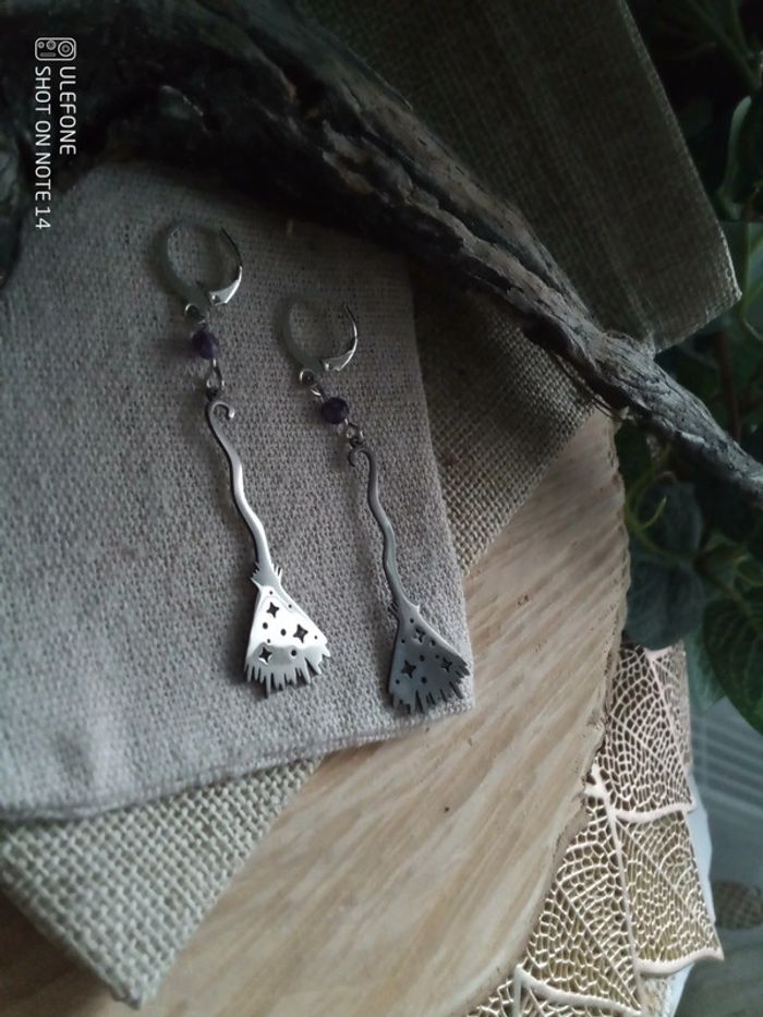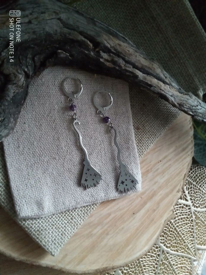 Boucles d'oreilles bohèmes balai sorcière pierres d'améthyste 💜.