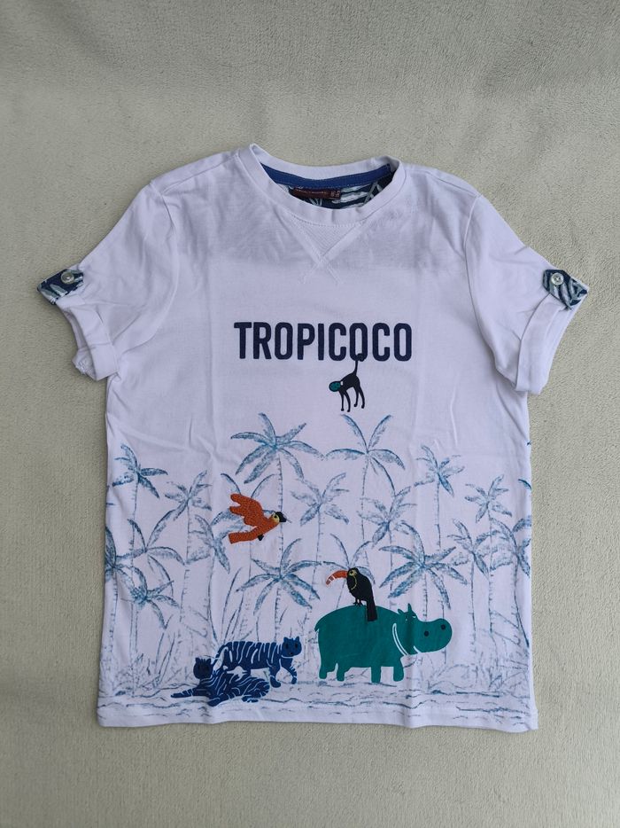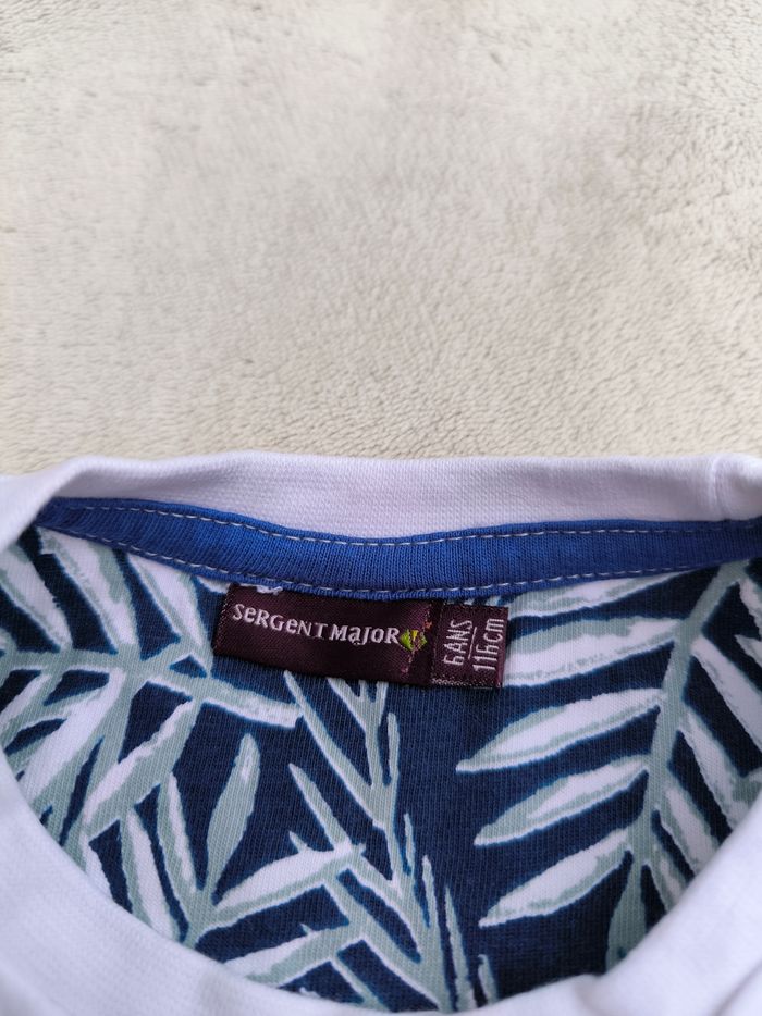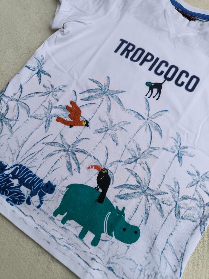 T-shirt à manches courtes Marque Sergent Major Taille 6 ans, 116 cm • Coloris blanc, marine, bleu • Inscription en velours "Tropicoco", imprimés palmiers, broderies oiseau/toucan, tigres en velours • Tissu fin Peu porté, en très bon état #evelyne_garcons_6ans #evelyne_garcons