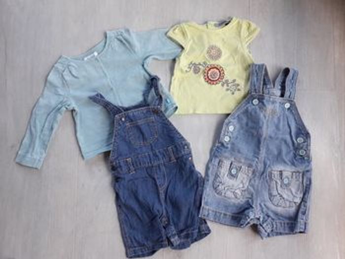 Lot de 2 salopettes shorts en jean des marques tex et Kiabi, 1 t-shirt manches courtes de la marque tape à l'oeil. Le tout est en très bon état et taille 6mois. Je donne également un gilet bleu taille 12mois. Il a une mini tache qui se voit de près mais il peut dépanner.