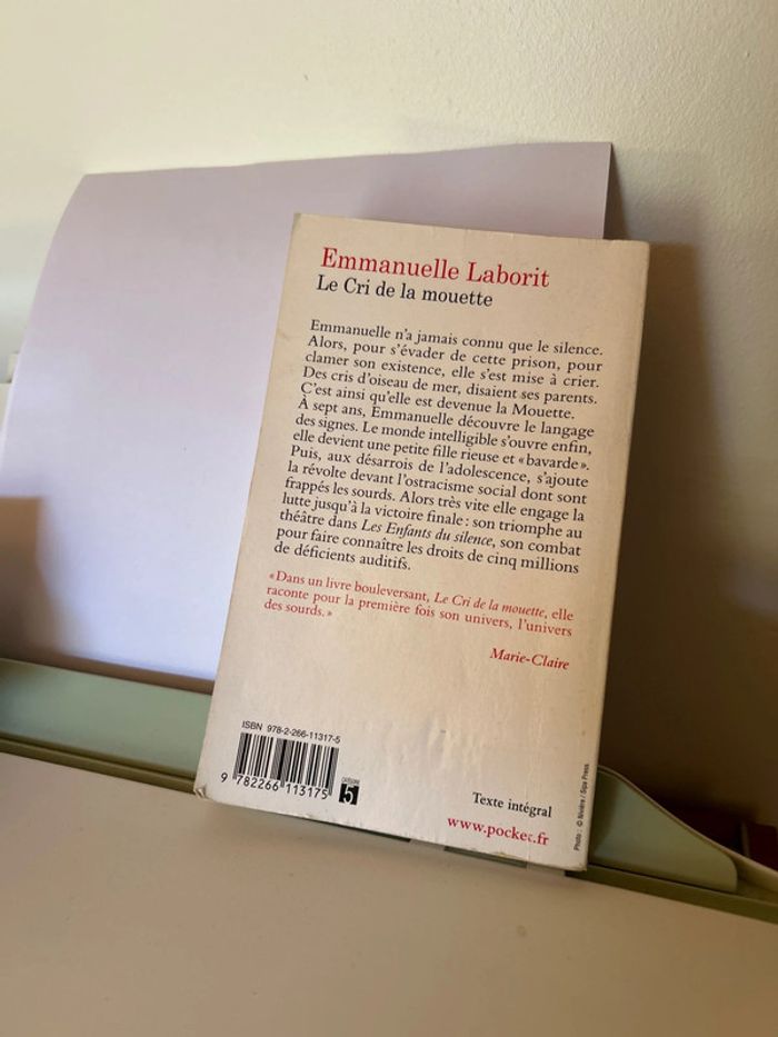 Livre Le cri de la mouette Emmanuelle Laborit Pages un peu jaunies dû à la vieillesse du livre (seulement les 2 premières et 2 dernières)