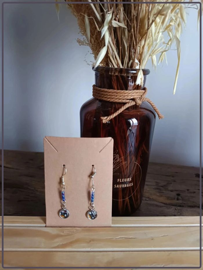 Paire de boucles d'oreilles avec cabochon rond en verre et perles de rocailles bleues