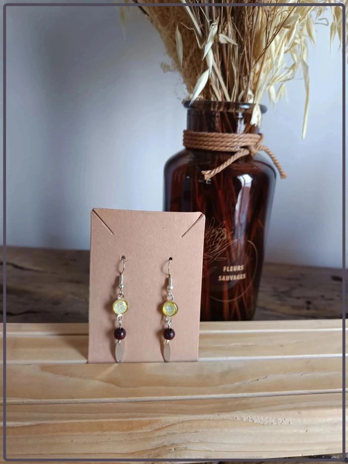 Paire de boucles d'oreilles avec petit cabochon rond doré pailleté et perle en bois marron