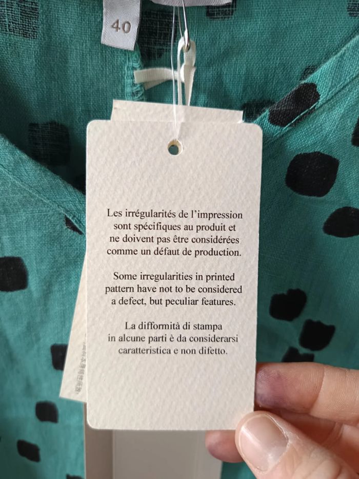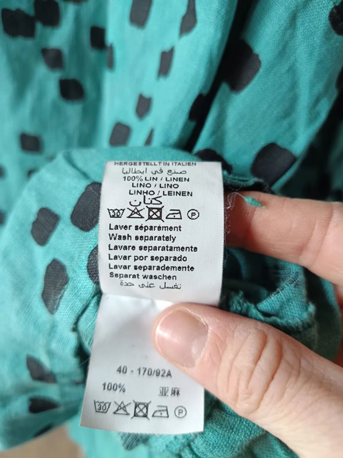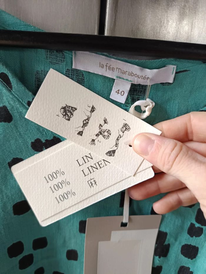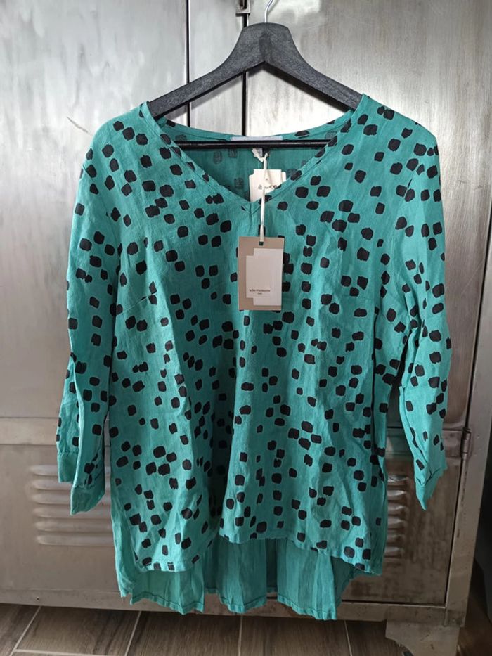 Blouse ¾ turquoise/verte à pois noirs. De la marque « La fée maraboutée ». Taille 40. Neuve. Composition : 100% lin Valeur neuf : 115€ N'hésitez pas à regrouper vos achats pour optimiser les frais de ports. #vetementneufmykonoa #vetementfemme40mykonoa