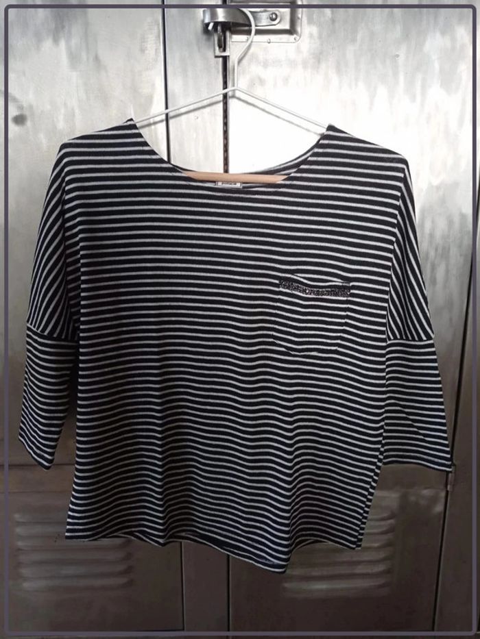Haut manches ¾ à rayures noires et blanches Pimkie bon état taille S - photo numéro 1