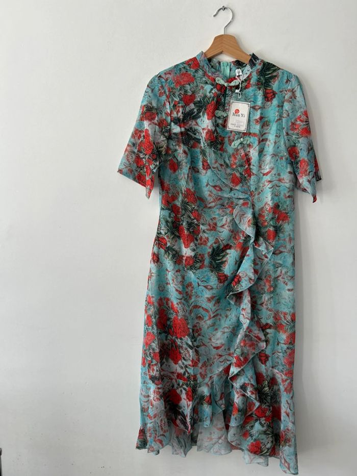 Description : Magnifique robe longue Han Yi, coupe fluide avec volants sur le bas. Motif floral aux tons turquoise, rouge et vert. Fermeture zippée dans le dos et détails style asiatique au col. Taille 3XL - convient parfaitement aux grandes tailles. Neuve avec étiquette, jamais portée. Idéale pour un événement, une cérémonie ou l’été ! État : Neuf avec étiquette Taille : 3XL Prix : [à toi de fixer — je peux t’aider si tu veux] N’hésite pas à me contacter pour plus de détails ou mesures !