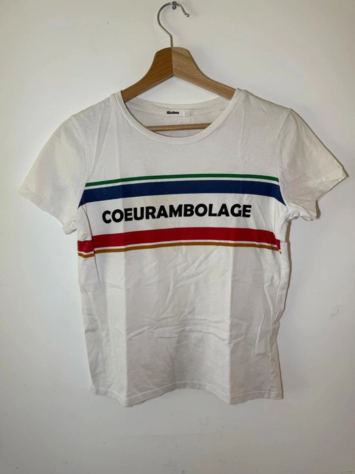 T-shirt blanc original de la marque BlzBoo, taille M. • Inscription “Coeurambolage” avec rayures colorées (vert, bleu, rouge). • Style décontracté et tendance. • En bon état général. #charlinefemmeM Envoi : Disponible pour envoi ou remise en main propre. Contactez-moi si vous avez des questions ou souhaitez plus de détails !