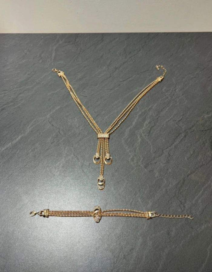 e vends ce superbe ensemble composé d’un collier et d’un bracelet dorés, parfaits pour une occasion spéciale ou pour sublimer une tenue. • État : neuf • Design raffiné avec des anneaux décoratifs et des strass. • Fermoir ajustable pour s’adapter à différentes tailles