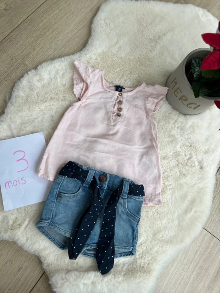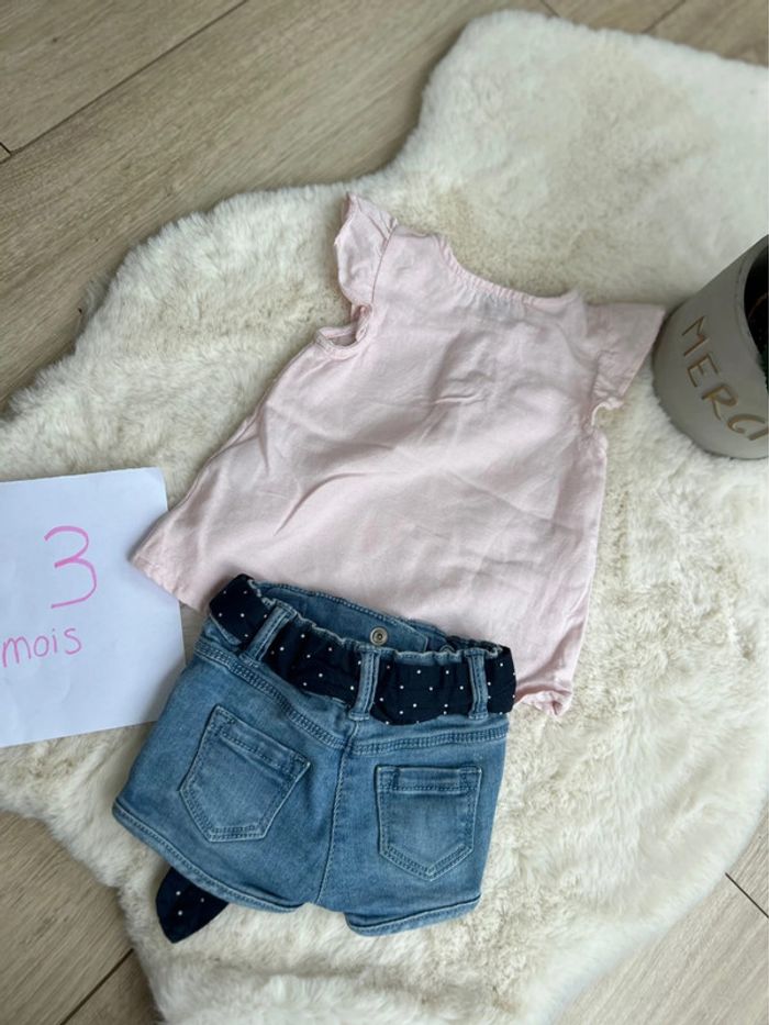 Jolie ensemble fille avec son tee shirt rose et son petit short en jean avec sa ceinture à pois Marque Kiabi Taille 3 mois En très bon état #charlinelolfille3mois N’hésitez pas si vous avez des questions