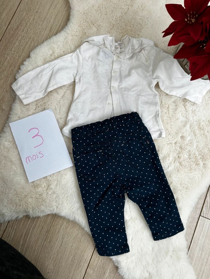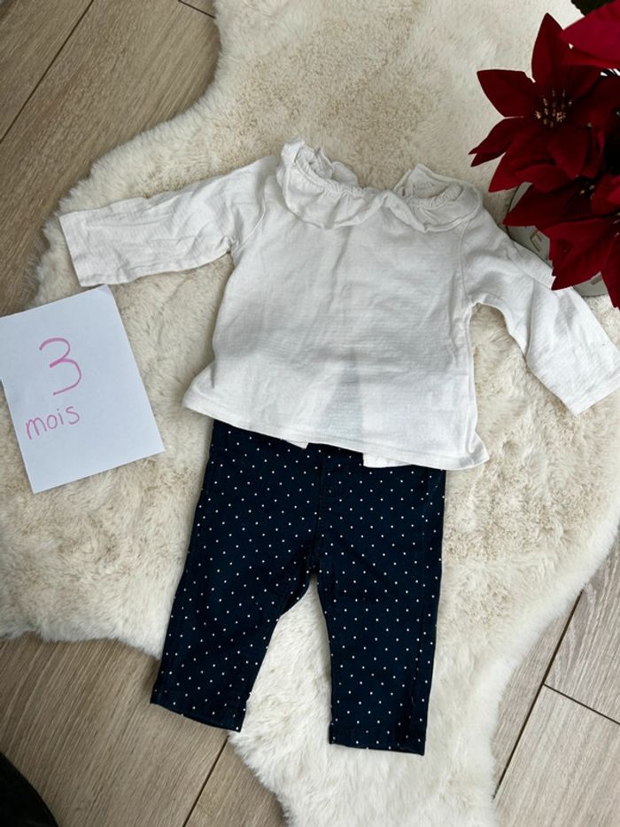 Jolie ensemble avec un pantalon à pois et un haut ML simple blanc Taille 3 mois En très bon état #charlinelolfille3mois N’hésitez pas si vous avez des questions