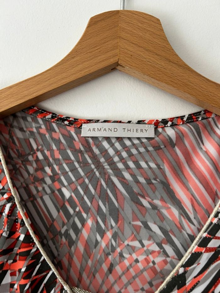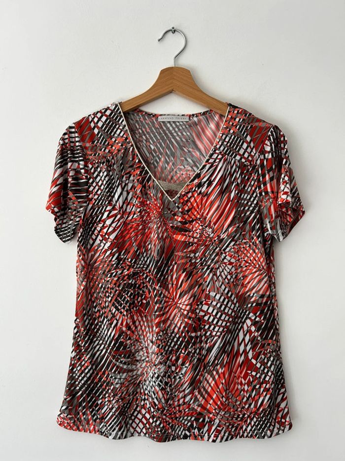 Haut à manches courtes de la marque Armand Thiery, en taille S. Motif graphique dans les tons rouge, noir, blanc et gris, très original et dynamique. Col en V, matière fluide et agréable à porter. État : Très bon état, porté une ou deux fois seulement. #charlinefemmeS Parfait pour égayer une tenue simple ou pour une touche de couleur au quotidien !