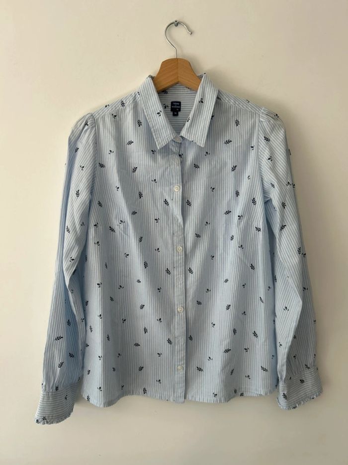 Jolie chemise à manches longues de la marque Terre de Marins, en taille 36. Motif à petites feuilles noires sur fond à fines rayures bleu clair. Coupe droite, boutonnage classique, col chemise. État : Très bon état, peu portée, aucun défaut à signaler. #charlinefemmeS Parfaite pour un look casual ou bureau. N’hésite pas à me contacter si tu as des questions !