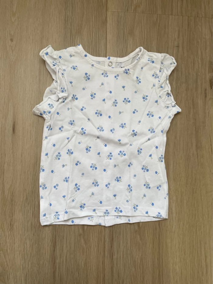 Tee shirt Kiabi sans manches blanc avec motif fleurs bleues état neuf, lavé mais jamais porté, taille 9 mois (prix neuf 4€)