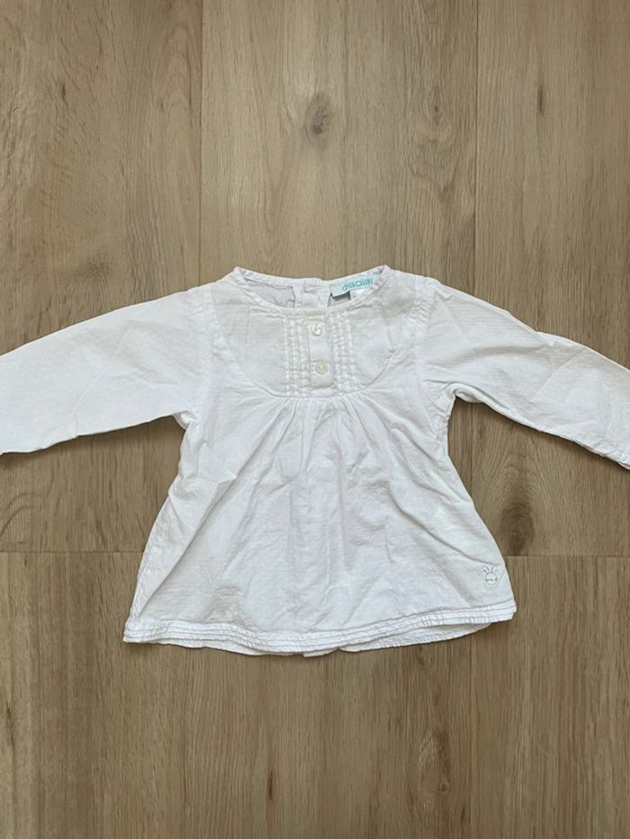 Chemisier Obaïbi blanc en bon état, légèrement jauni au col, en taille 6 mois