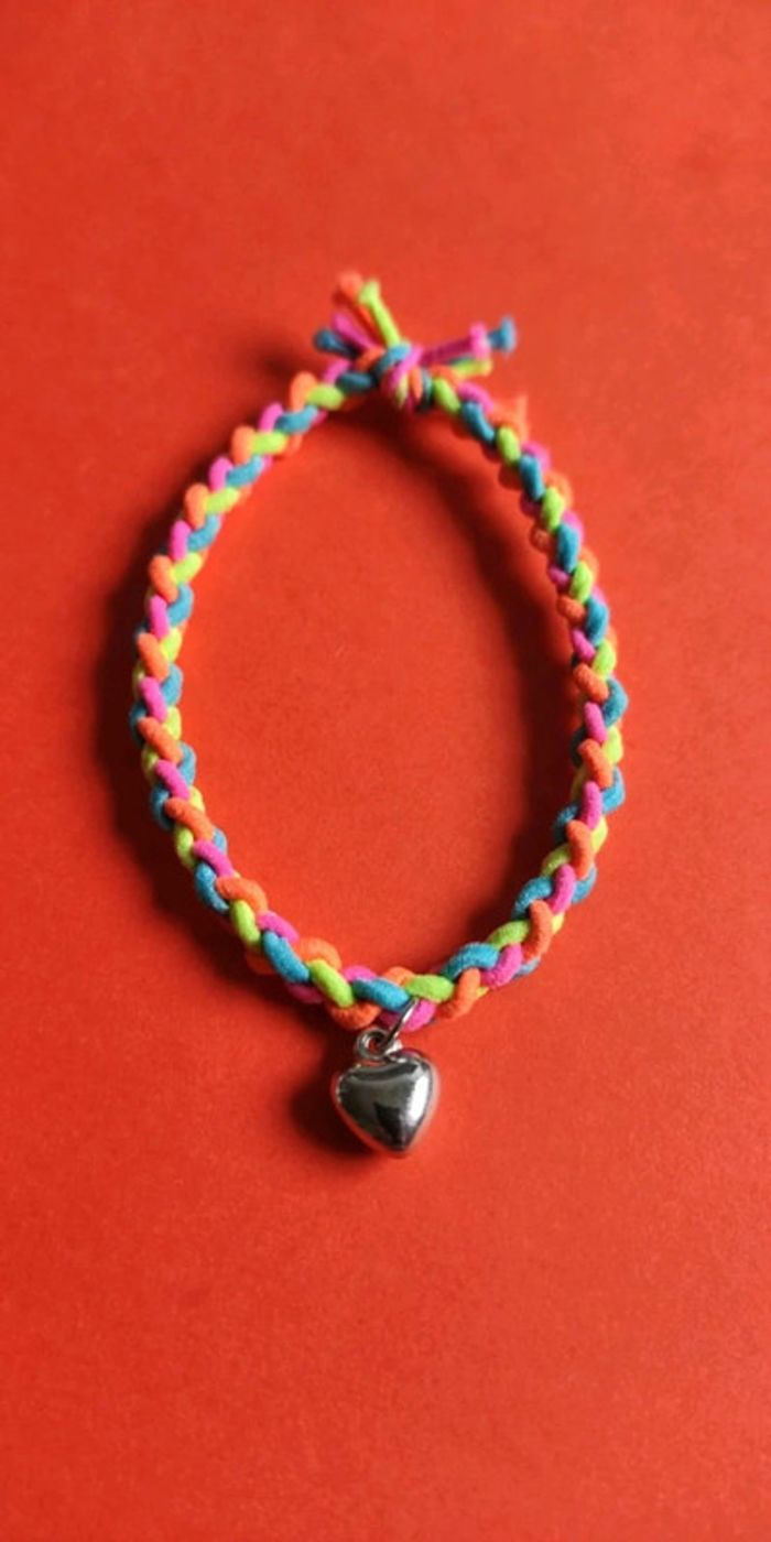 Bracelet tressé bleu, vert, orange et rose fluo Avec un cœur argenté Neuf, jamais porté Extensible, pas d'attaches, bien plus pratique !