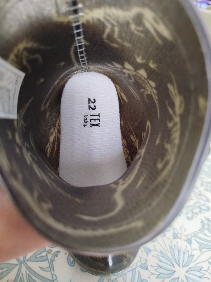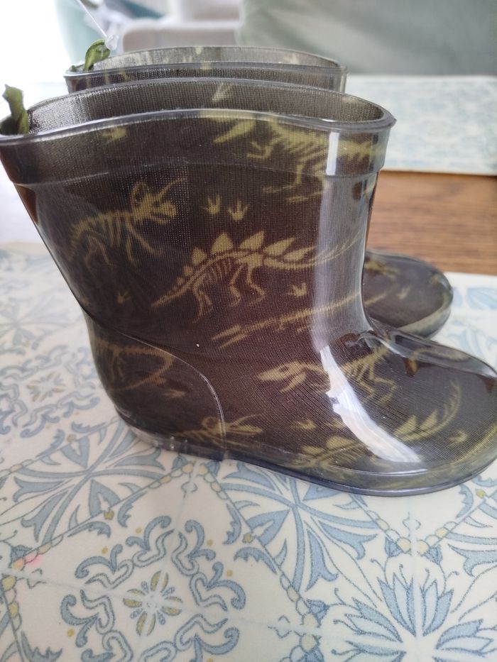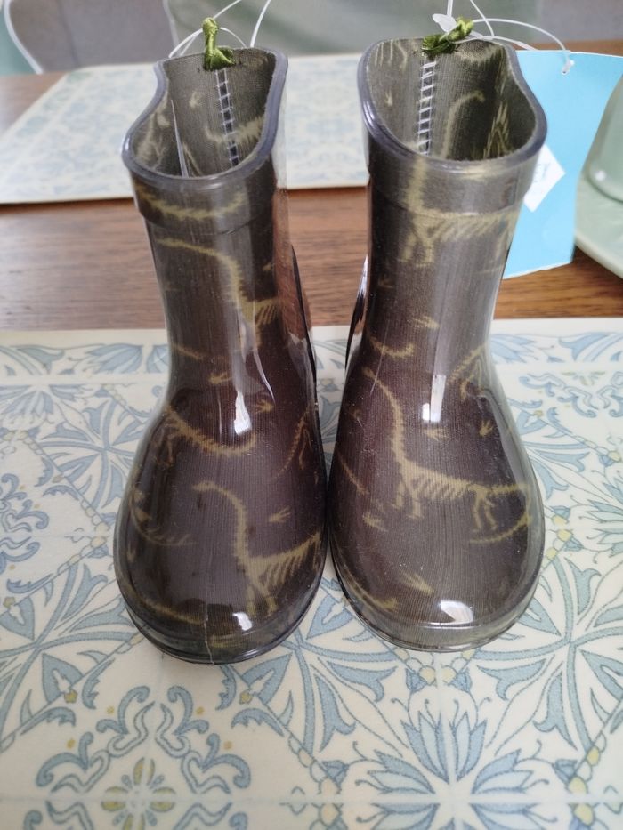 Neuve avec étiquette Bottes de pluie de couleur kaki avec des motifs dinosaures Pointure 22