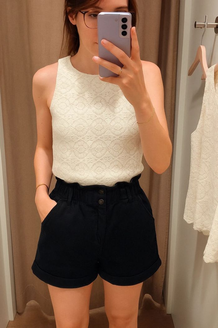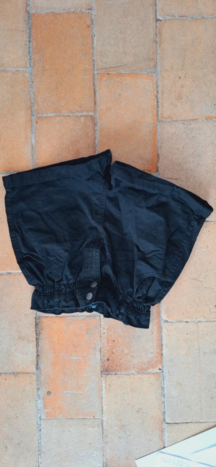 Short taille haute noir style paperbag Description : Short noir en coton style paperbag, taille haute avec élastique à la taille. Deux poches sur les côtés, revers en bas, très confortable et léger. Fermeture par bouton + zip. Parfait pour le printemps/été, facile à assortir avec un haut en dentelle ou un t-shirt simple. Taille : 34 (convient aussi à un 32 grâce à la taille élastique) État : état neuf Marque : kiabi Couleur : noir