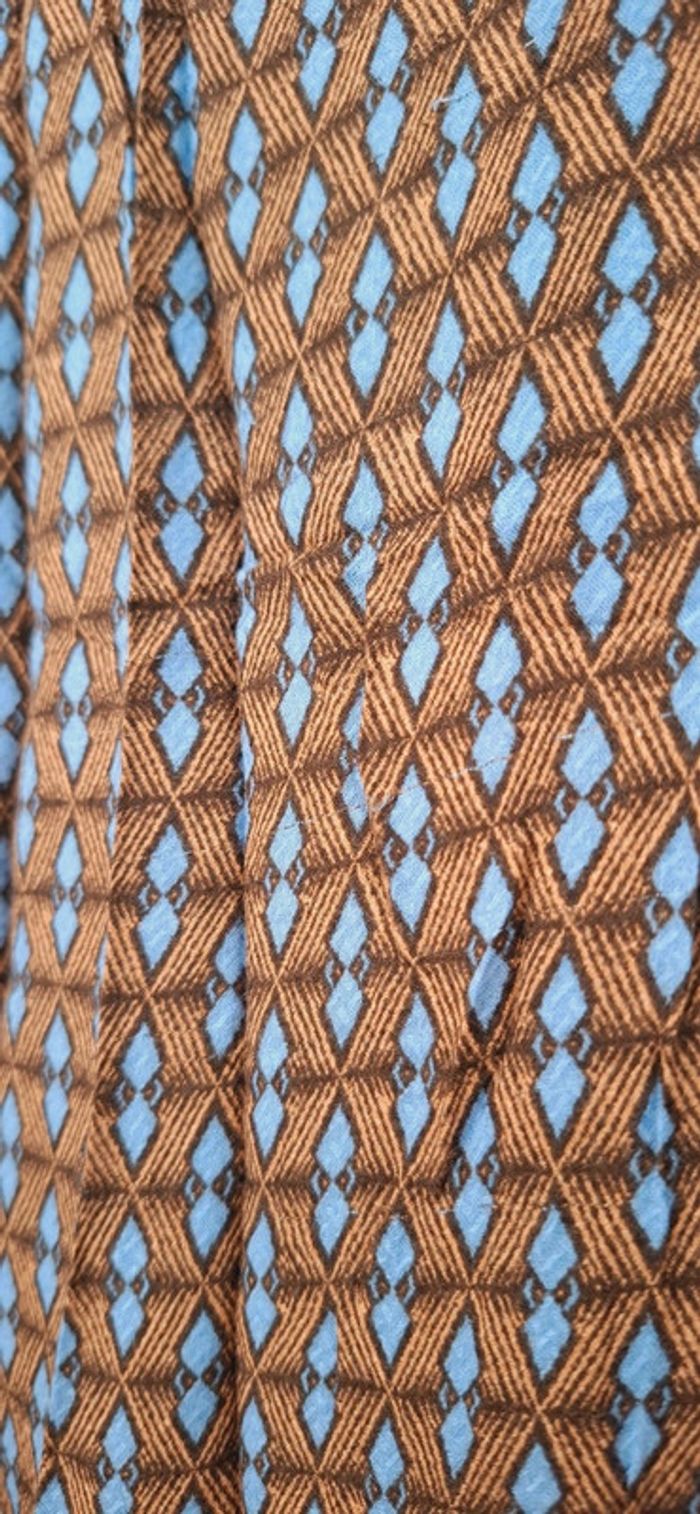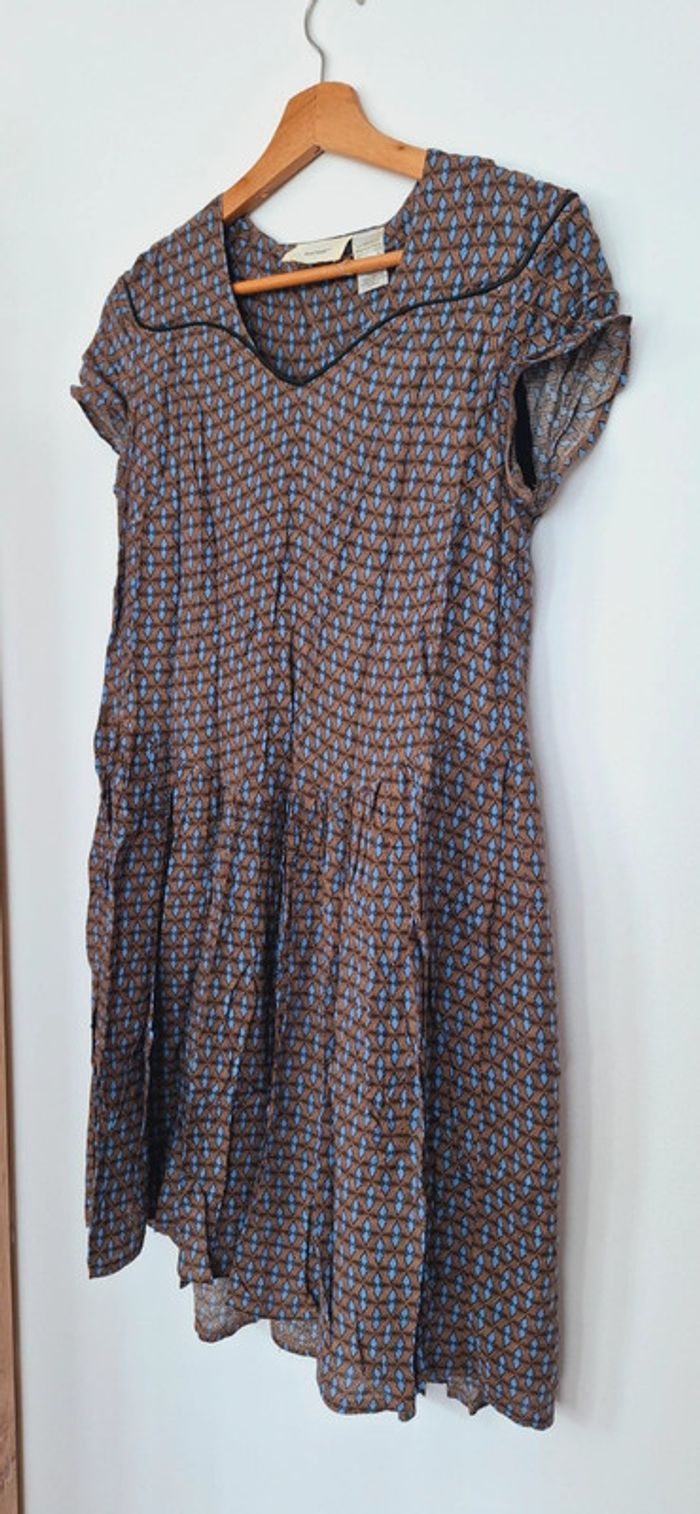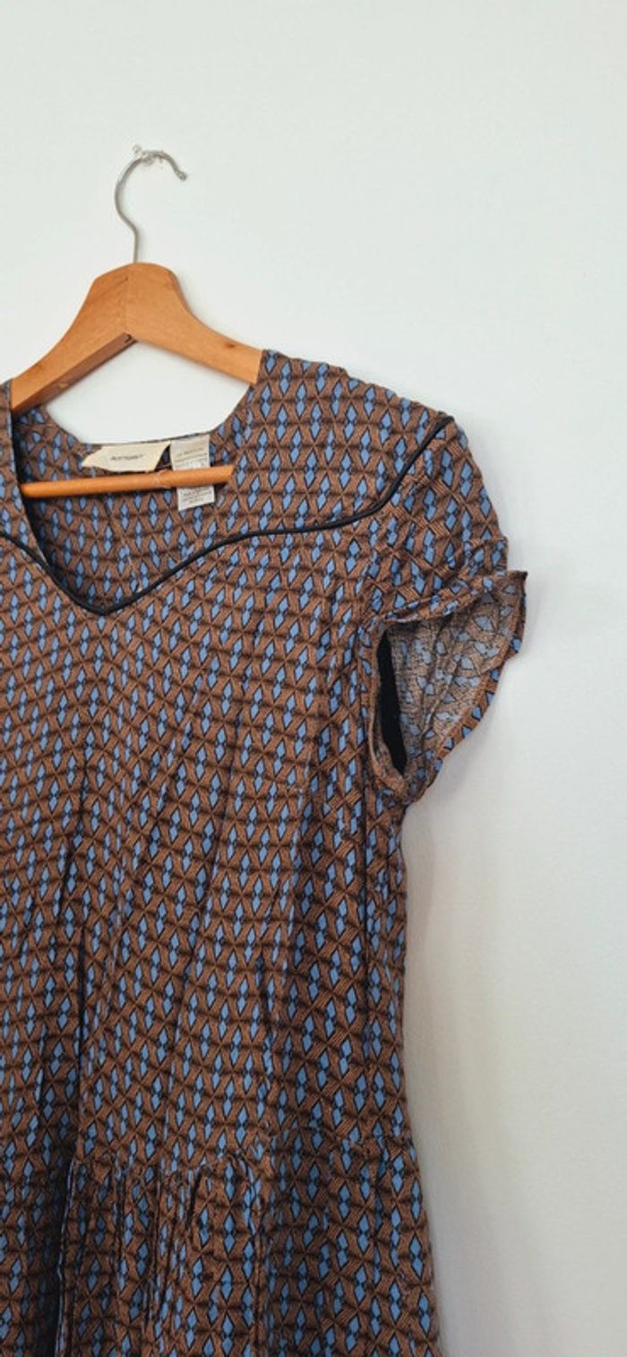 Robe légère imprimée La Redoute - Esprit rétro chic 🟤 Confort et style réunis dans cette robe fluide au joli motif géométrique vintage 💫 📌 Détails : Marque : La Redoute Collections Taille : 38 (convient aussi à un petit 40 – coupe ample) Motif : Imprimé graphique bleu & camel – original sans être trop chargé Matière : Voile léger doublé – parfaite pour la mi-saison ou l’été Coupe : Fluide et évasée, manches courtes légèrement froncées, encolure arrondie avec découpe en V soulignée d’un passepoil Longueur : Mi-cuisse ✨ Pourquoi on l’adore ? Ultra confortable et facile à porter Look casual chic à accessoiriser facilement Un vrai petit caméléon du dressing : boots + veste pour l’automne 🍂, ou sandales + panier en été ☀️ 🧼 Très bon état, peu portée Petite pépite à petit prix, idéale pour les fans de looks rétro et effortless 🤎 * photo portée effectuée par l’ia. La robe n’est pas forcément exactement pareil dans les détails. Merci de vous fier au photo sur cintre concernant les détails.