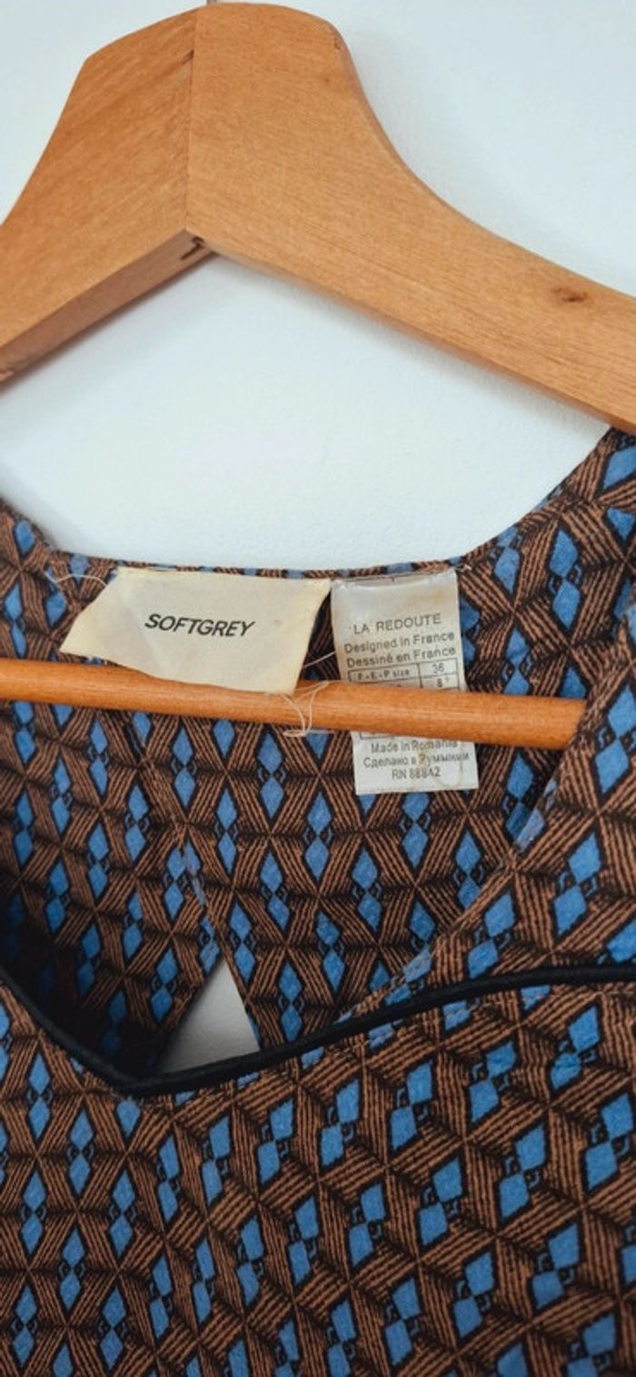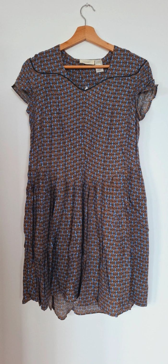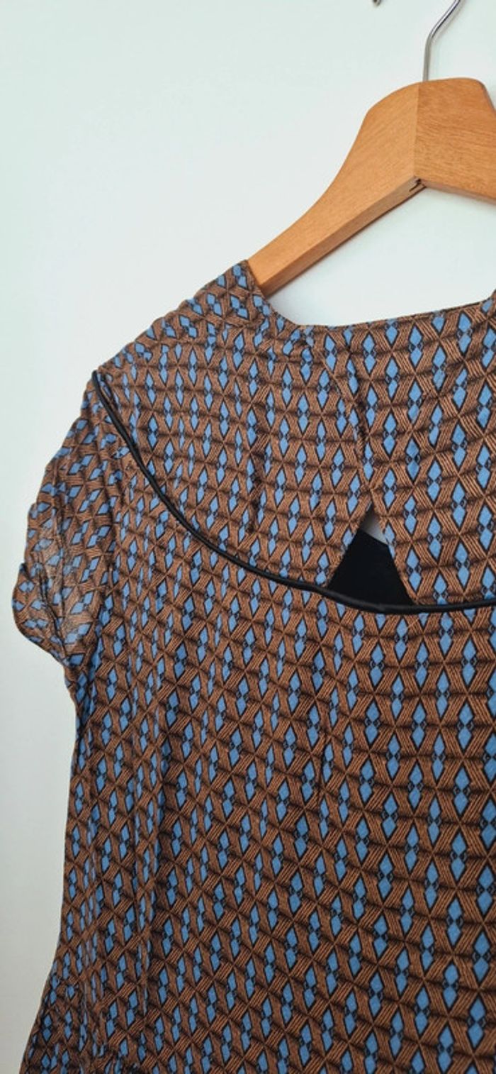 Robe légère imprimée La Redoute - Esprit rétro chic 🟤 Confort et style réunis dans cette robe fluide au joli motif géométrique vintage 💫 📌 Détails : Marque : La Redoute Collections Taille : 38 (convient aussi à un petit 40 – coupe ample) Motif : Imprimé graphique bleu & camel – original sans être trop chargé Matière : Voile léger doublé – parfaite pour la mi-saison ou l’été Coupe : Fluide et évasée, manches courtes légèrement froncées, encolure arrondie avec découpe en V soulignée d’un passepoil Longueur : Mi-cuisse ✨ Pourquoi on l’adore ? Ultra confortable et facile à porter Look casual chic à accessoiriser facilement Un vrai petit caméléon du dressing : boots + veste pour l’automne 🍂, ou sandales + panier en été ☀️ 🧼 Très bon état, peu portée Petite pépite à petit prix, idéale pour les fans de looks rétro et effortless 🤎 * photo portée effectuée par l’ia. La robe n’est pas forcément exactement pareil dans les détails. Merci de vous fier au photo sur cintre concernant les détails.