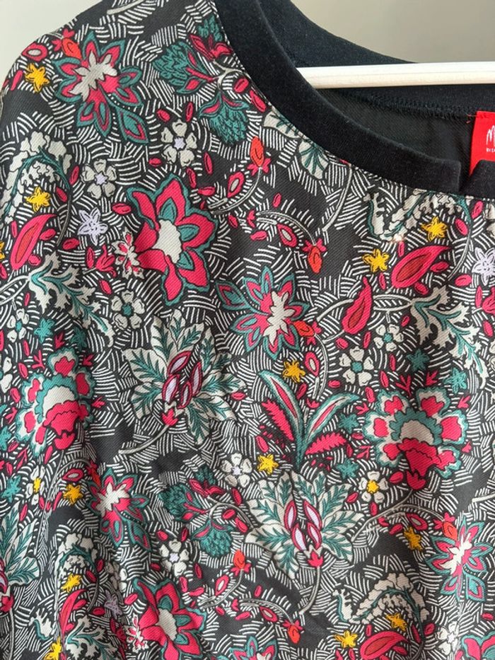 Blouse manches 3/4 Motifs fleurs sur fond gris et derrière noir Captain tortue Taille 42 En très bon état