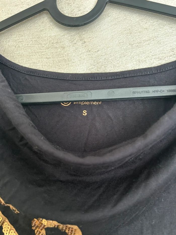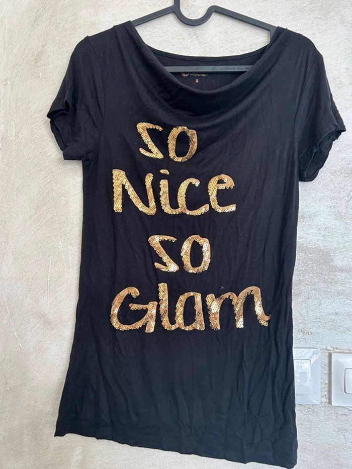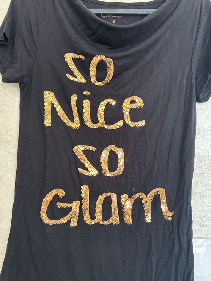 T-shirt noir Avec écriture de paillettes dorées Taille S En très bon état Box 6