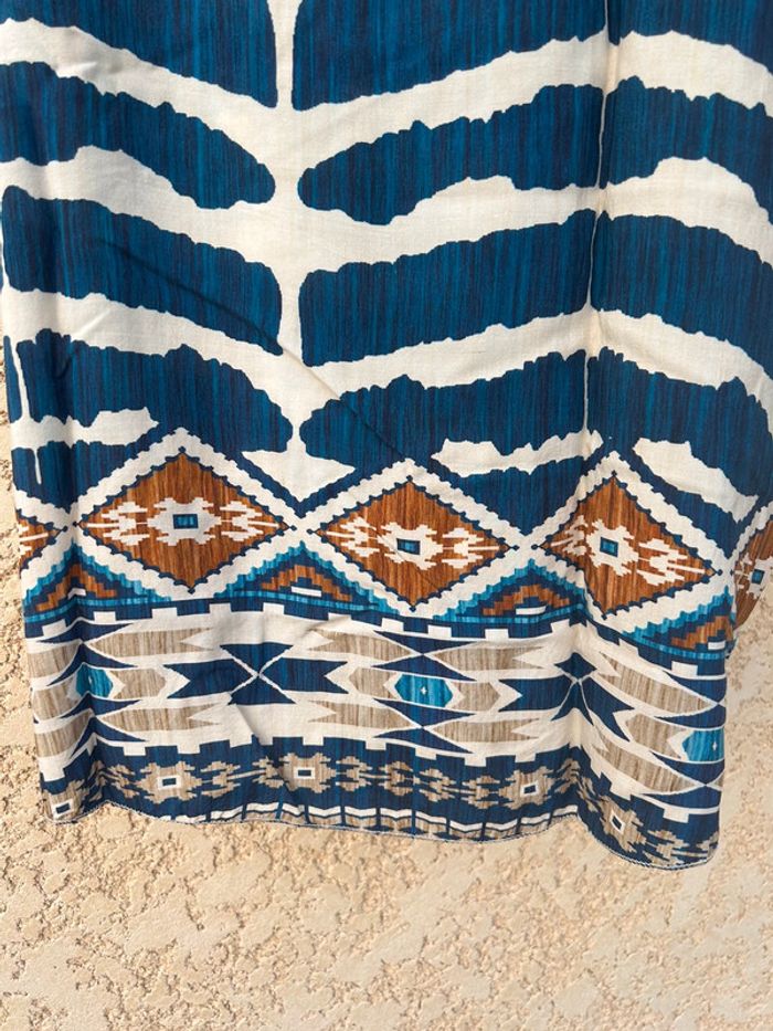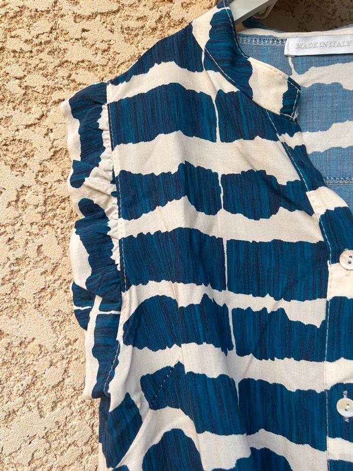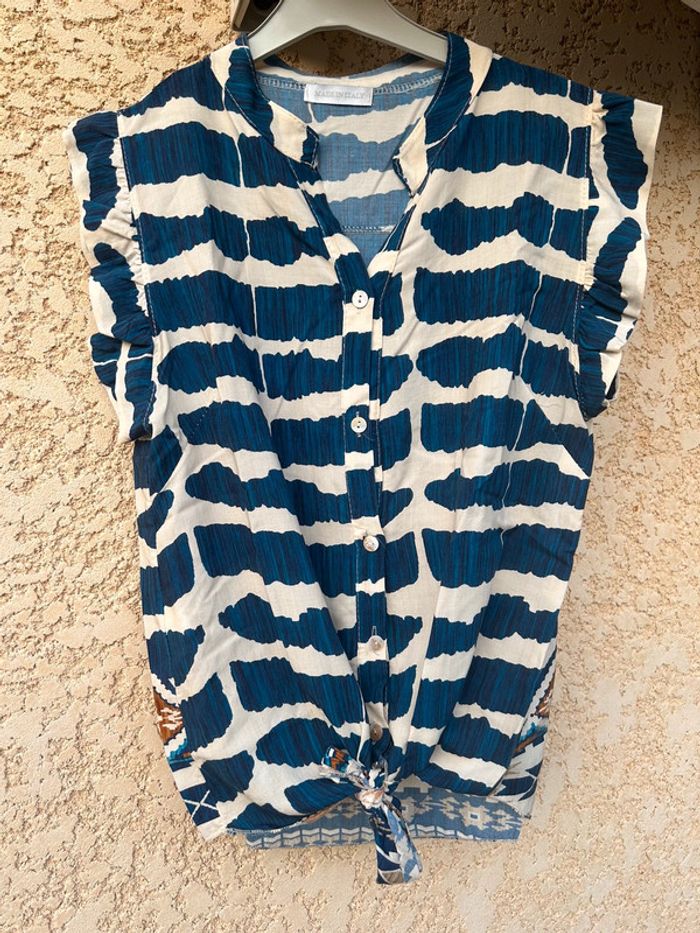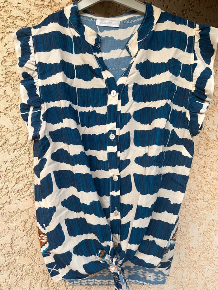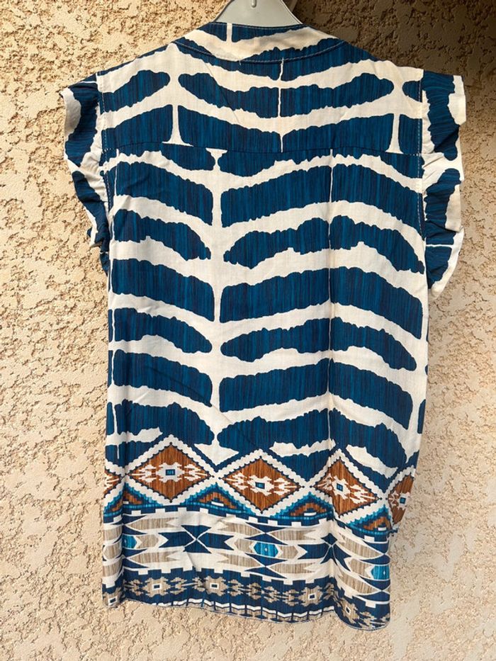 Tee shirt a rayures bleus et blanche et avec des détails de mosaïques sur le bas En très bon état Taille unique
