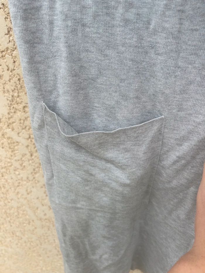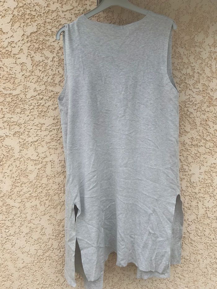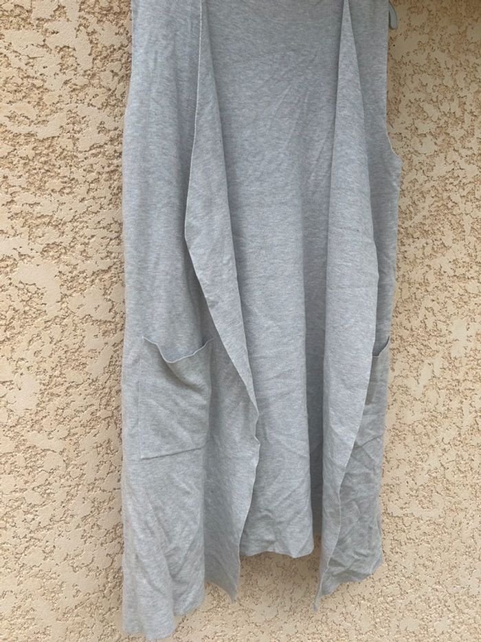 Gilet long gris de la marque stradivarius Neuf sans étiquettes, il n’a jamais été porté Il dispose de deux grandes poches devant Gilet manches courtes avec deux ouvertures sur les côtes Taille M CaisseA