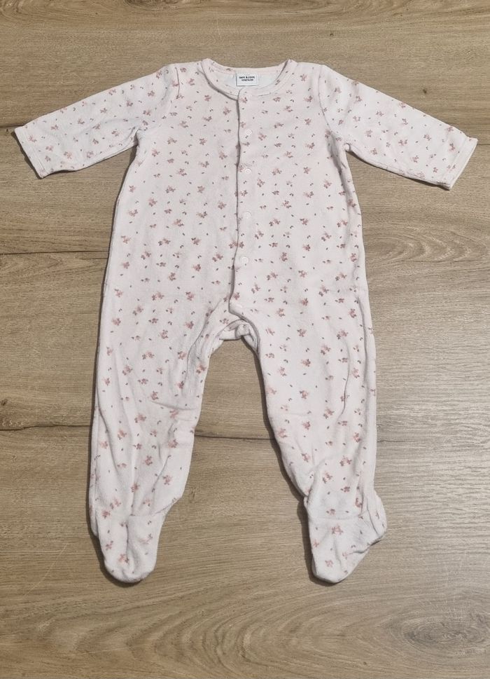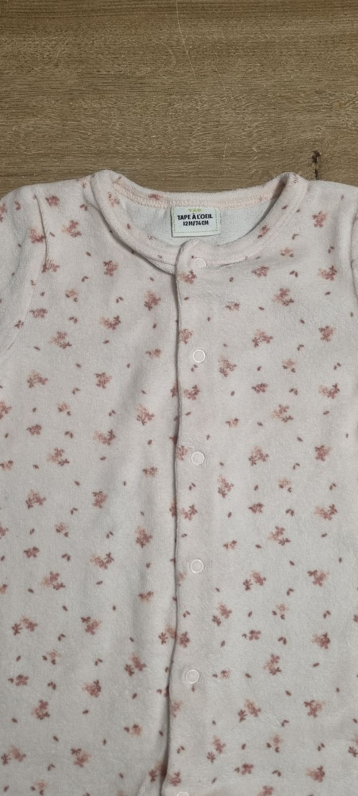 Pyjama grenouillère en velours à motifs fleuris Fermeture par boutons pression à l'avant et entre les jambes Tape à l'œil taille 12 mois Très bon état
