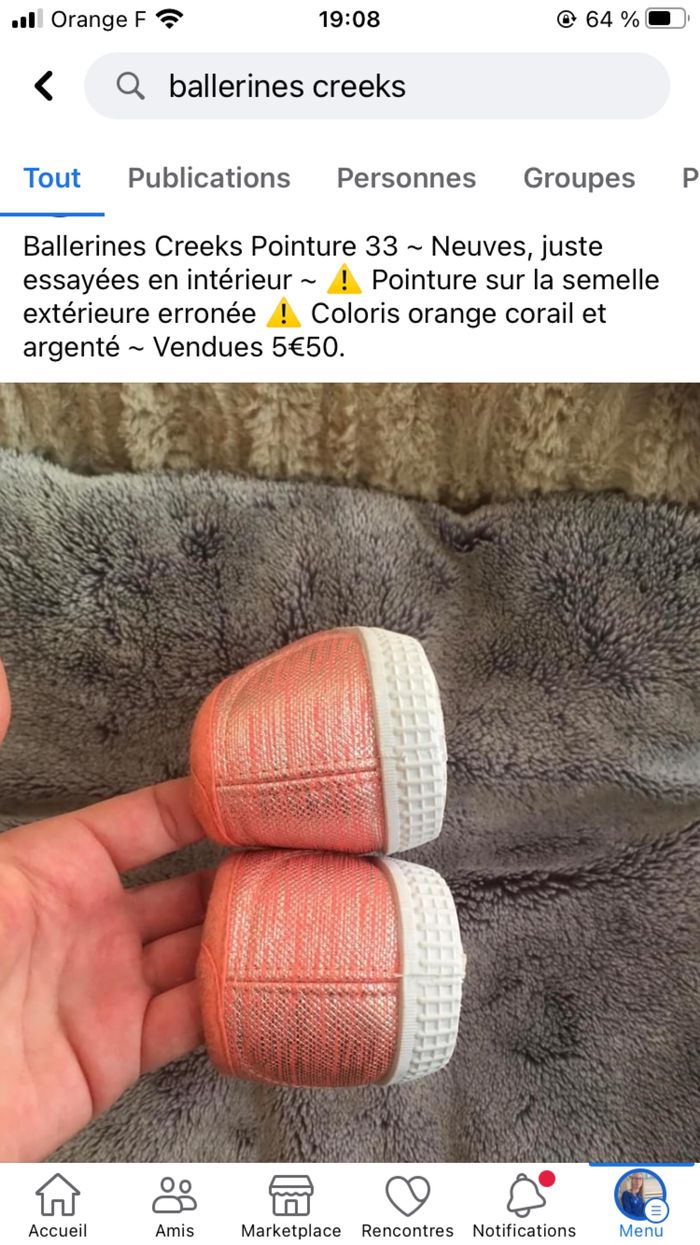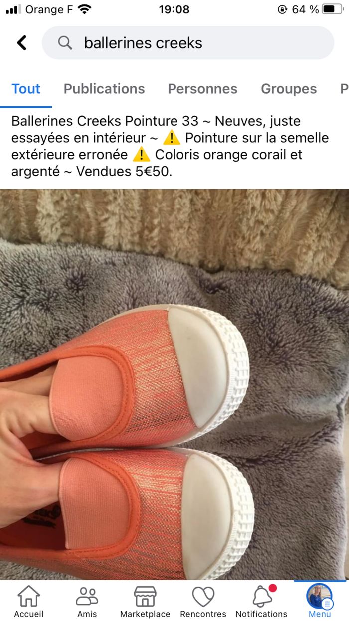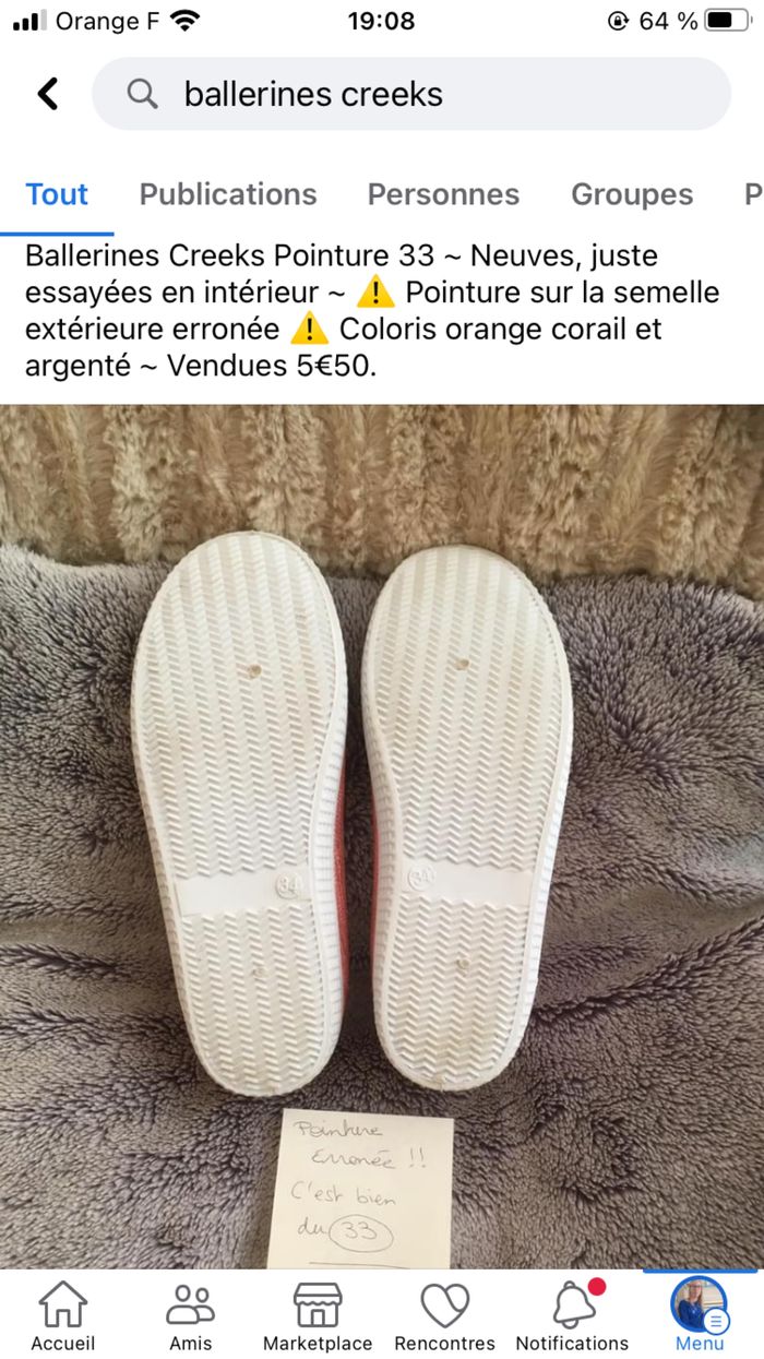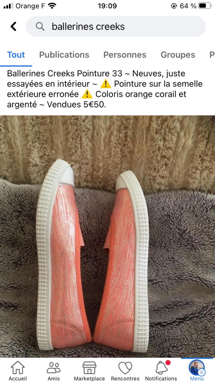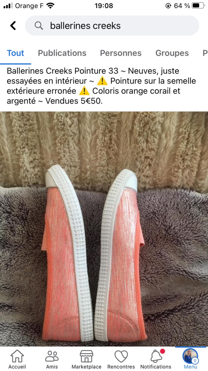 Ballerines Creeks Pointure 33 ~ Neuves, juste essayées en intérieur ~ ⚠️ Pointure sur la semelle extérieure erronée ⚠️ Coloris orange corail et argenté ~ Vendues 5€50 Impossible de charger les autres photos, je peux les envoyer par msg si besoin