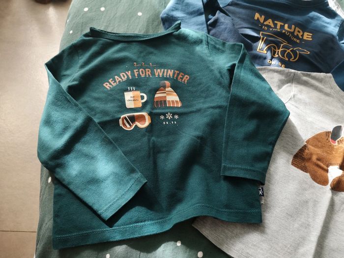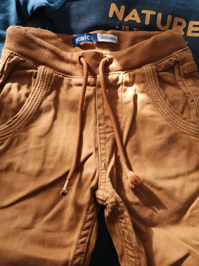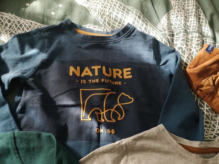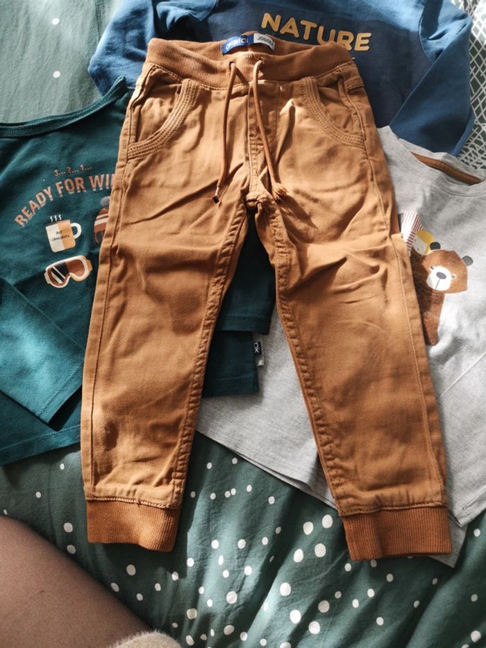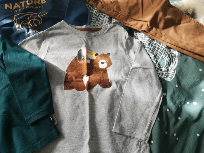 Beau pantalon noisette en très bon état excepté le cordon de serrage sur un des 2 bouts. 3 ans 3 T shirts manches longues 3 ans à motifs 1er achat ! Très bon état