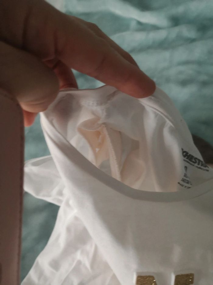 T shirt blanc cassé et inscription doré manches longues avec épaulettes