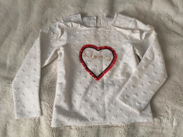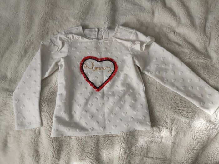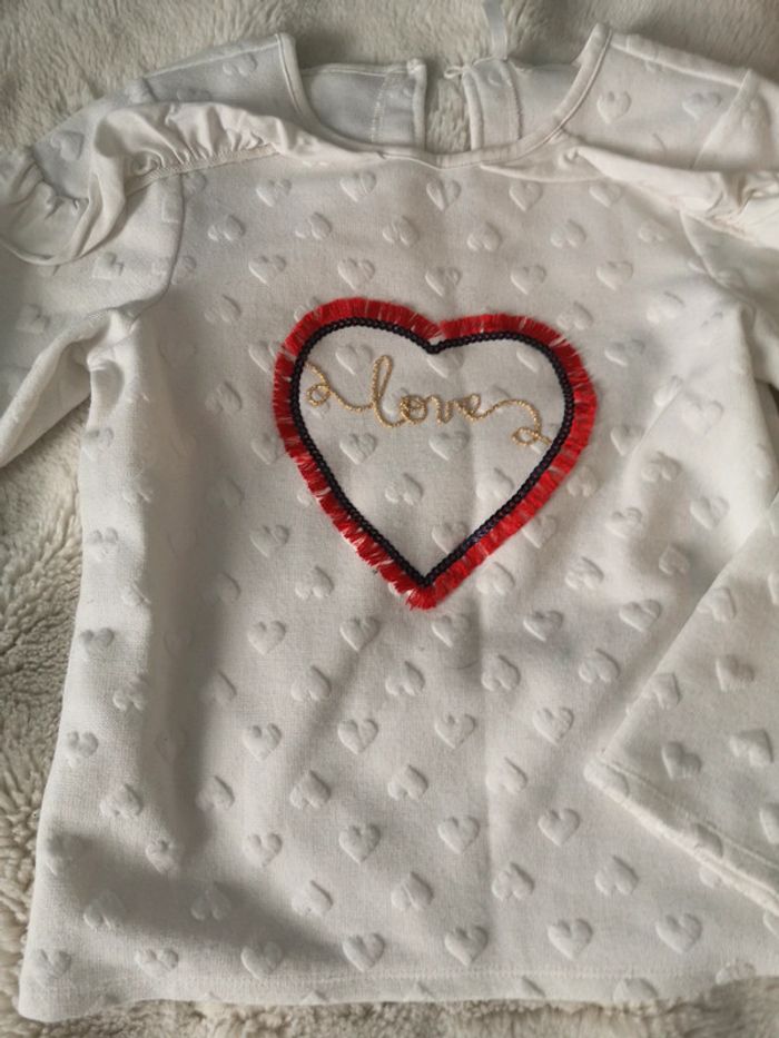 T-shirt manches longues avec des relief cœur épaule avec volant fermeture d'eau avec un petit bouton un cœur brodé rouge et marquer love au fil doré