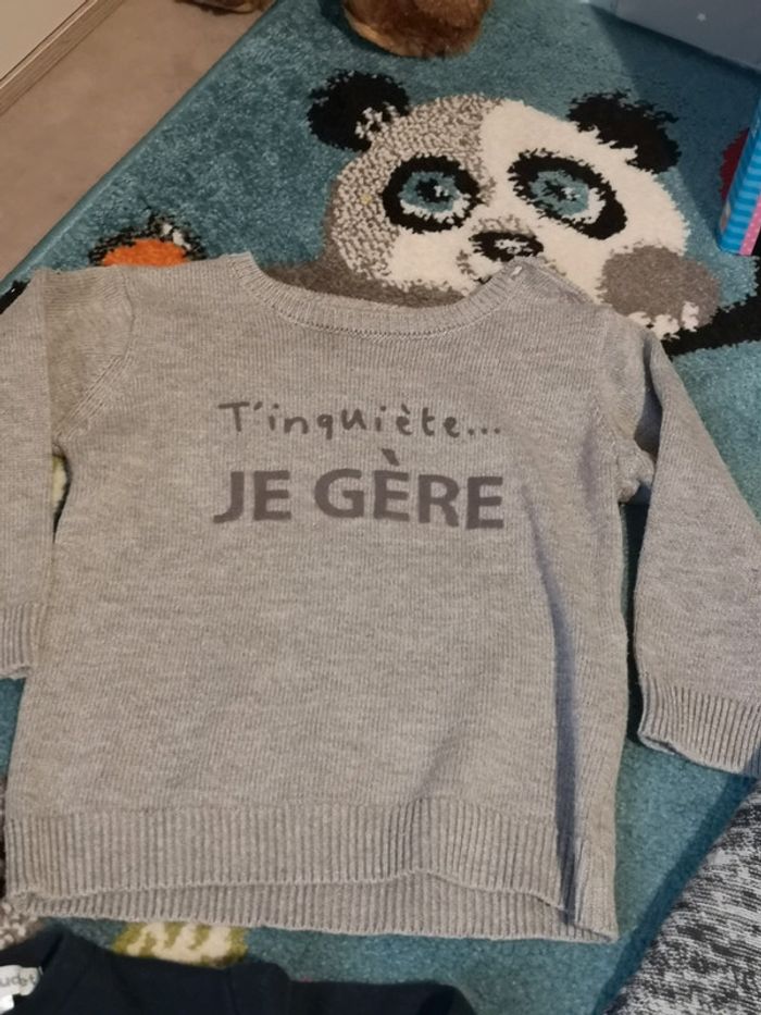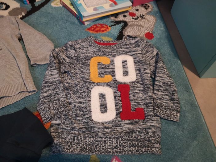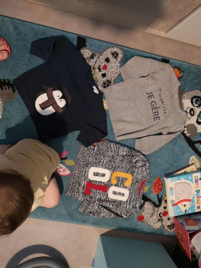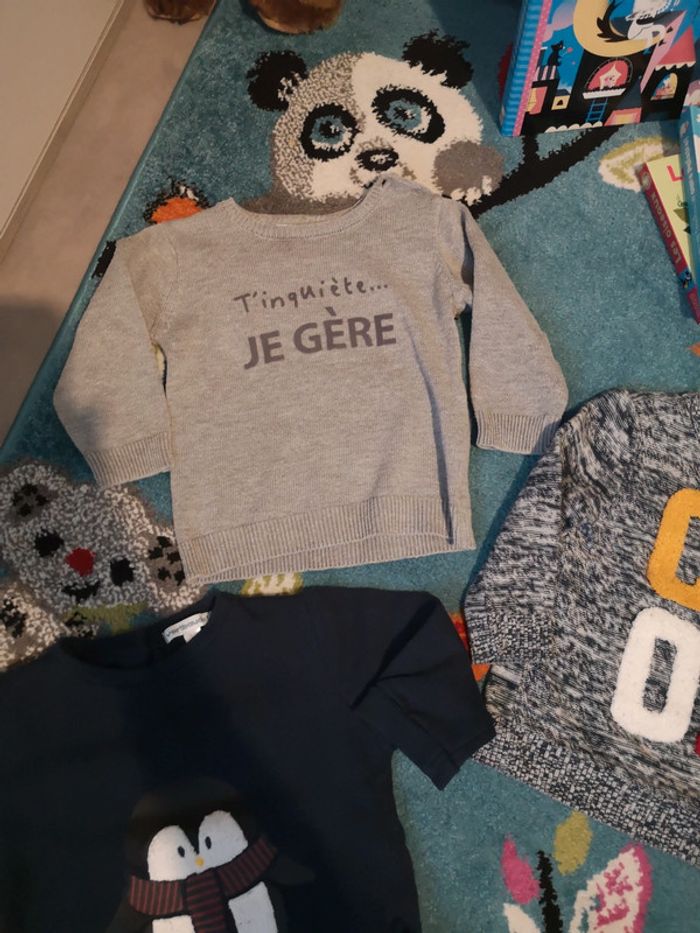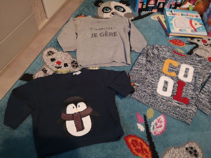(1 pull verbaudet bleu molletonné patch Pingouin 🐧pressions nuque (VENDU!) ⚠️) 1 pull gris "t'inquiète je gère" boutons épaules de Pat et Ripaton 1 pull chiné inscription COOL multicolor pression épaule d Orchestra 12 MOIS TRÈS Bon état 1ers achats 2020 2021