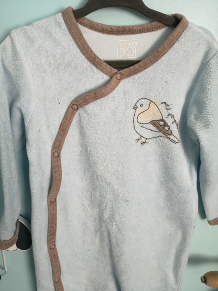 Acheté sur la redoute, grenouillère bleu ciel avec pressions avant et petit oiseau Velours 18 mois Pieds antidérapants