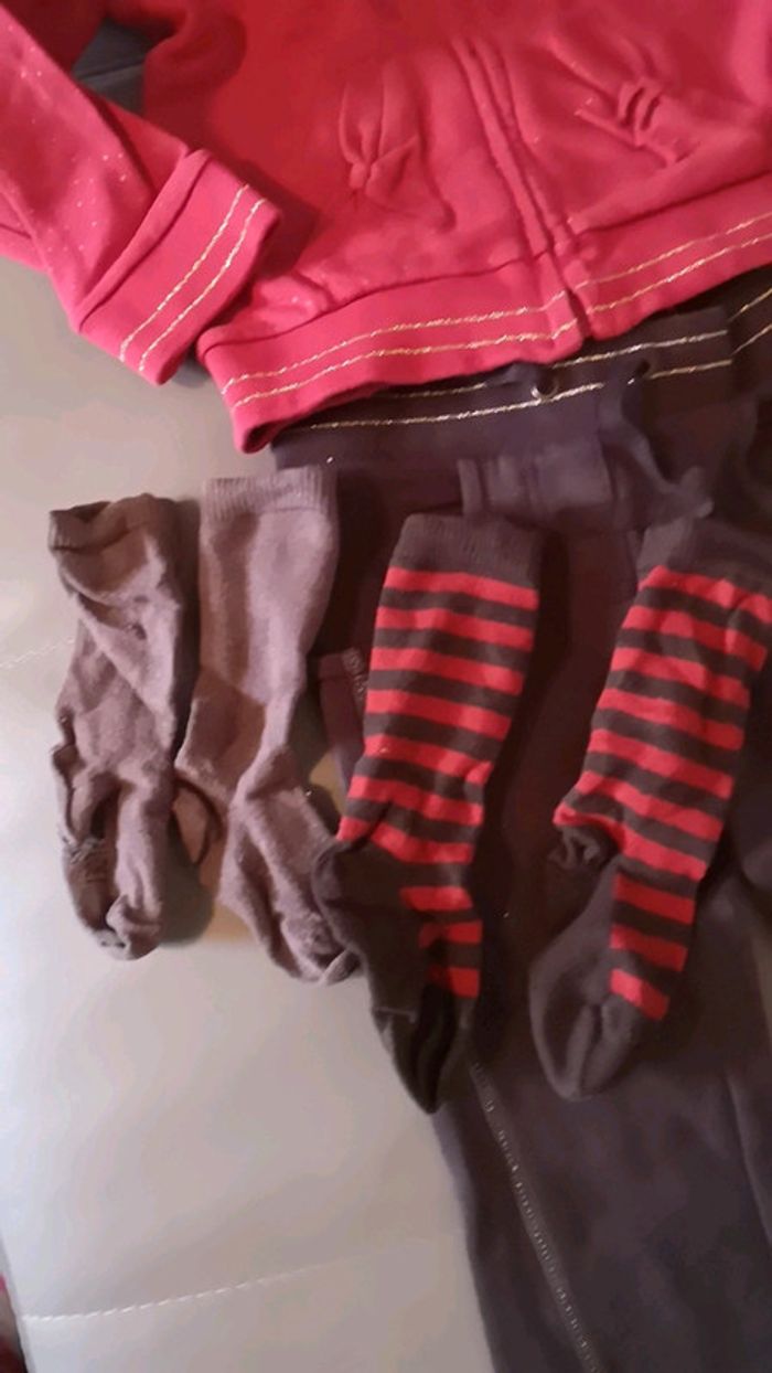 Jogging pantalon brun et dorure coutures + gilet rouge dorure couture jaune fluo et brun + 2 paires de chaussettes verbaudet assorties