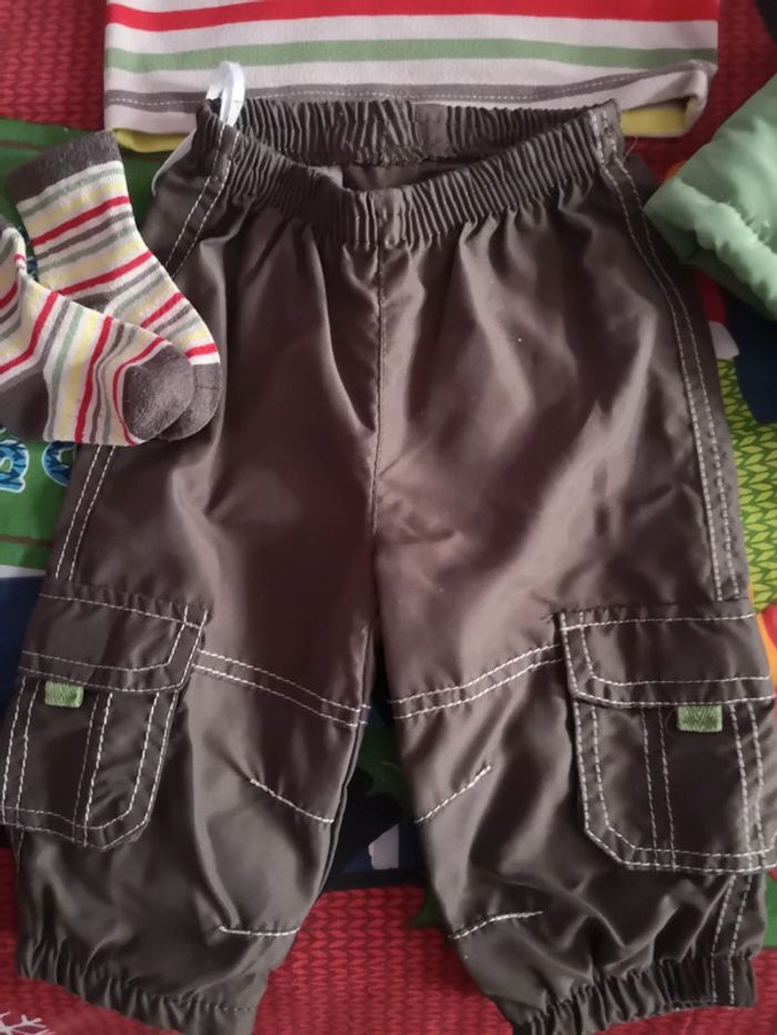 Pantalon brun à poches taille élastique top manches longues rayé Chaussettes rayés Doudoune sans manches verte Très peu porté