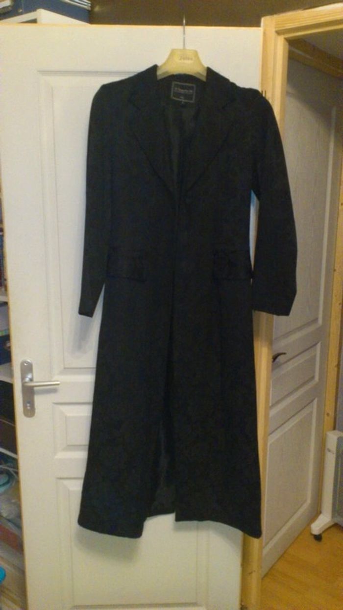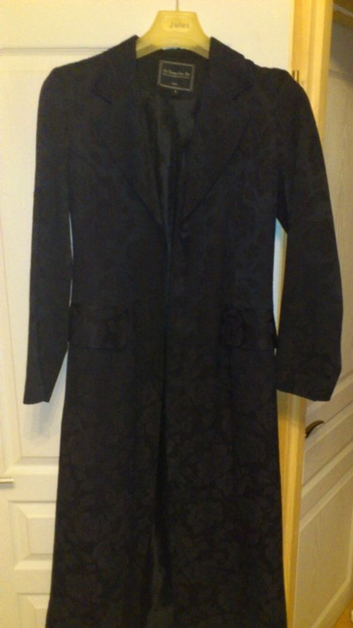 très chic cette longue veste noire habillé et mi saison polyester taille 36/38 manque 1 bouton que je peux remettre à la demande ou non effet soyeux brillant et mat à la fois