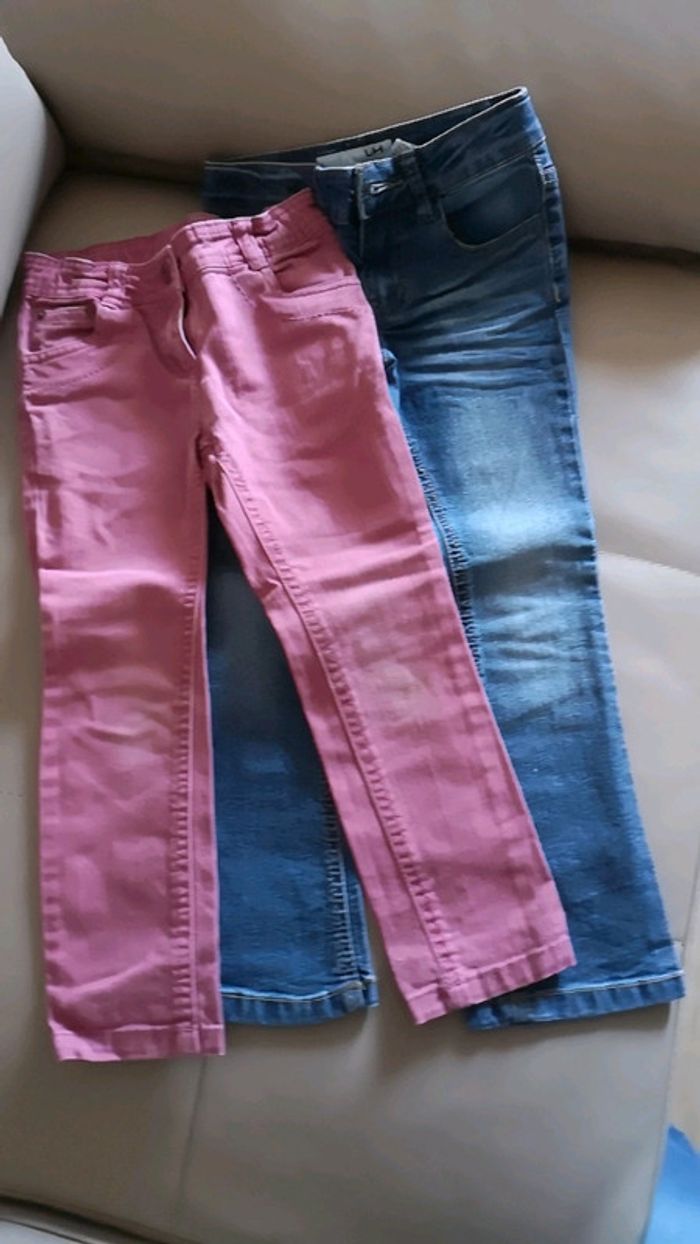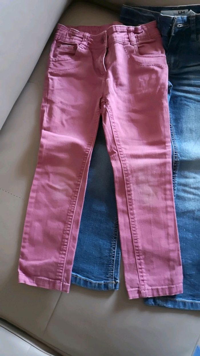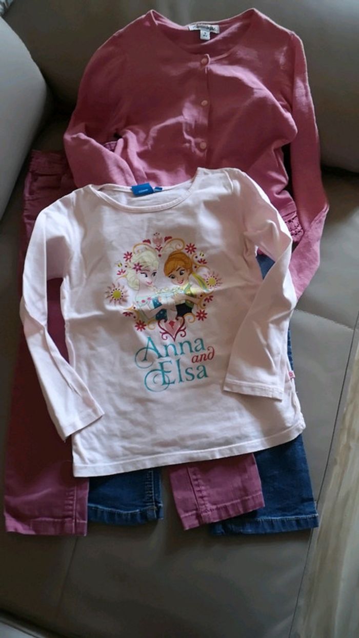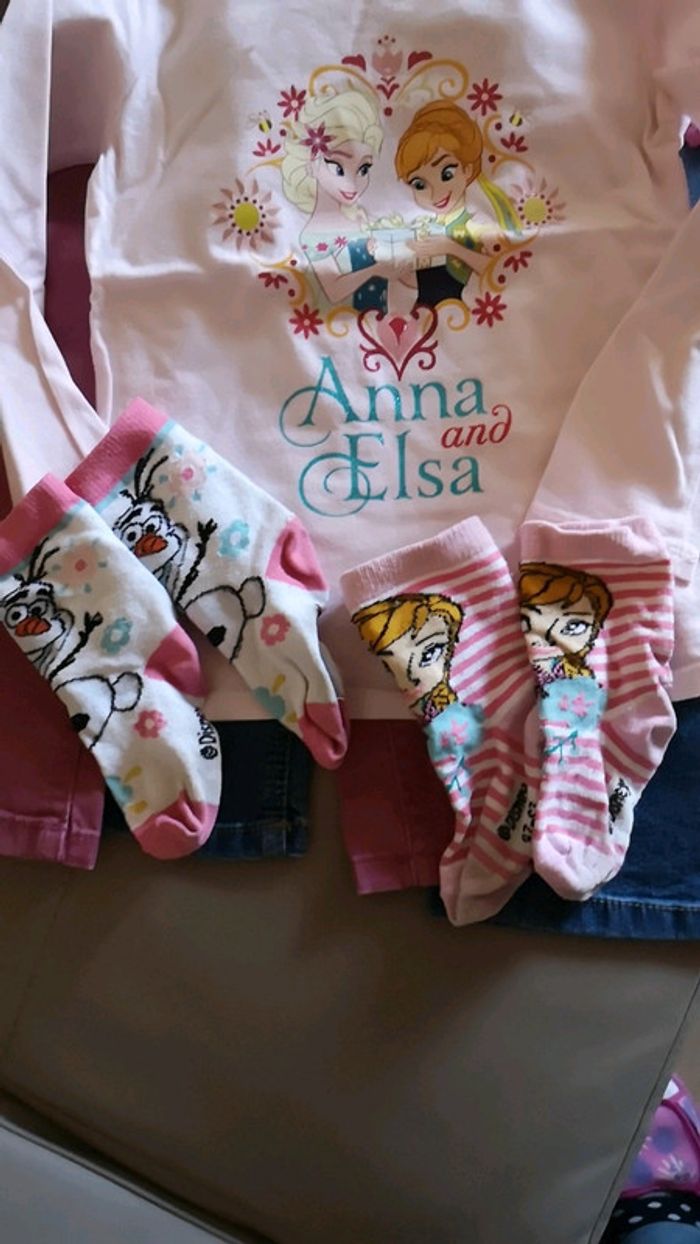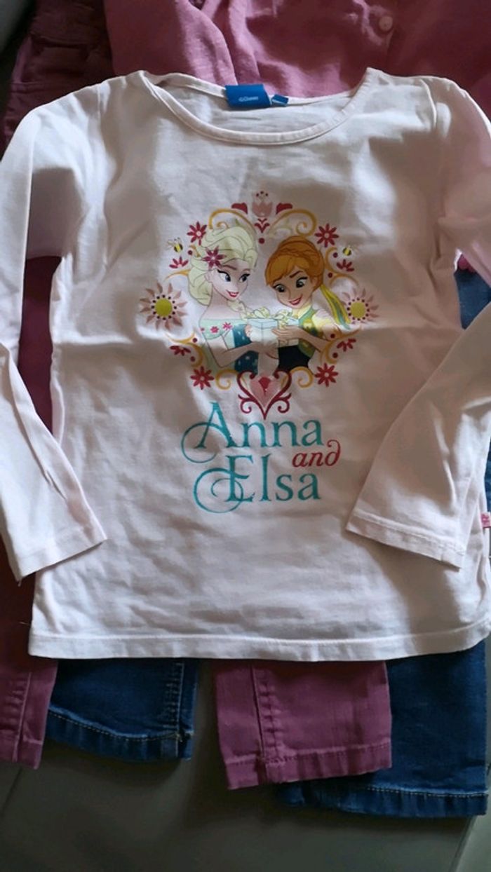 Un jean slim rose un jean bleu de la Halle t-shirt manches longues Reine des Neiges 3 paires de chaussettes une d'Olaf une de Anna et 1 Elsa 23-26 Top manches longues rose à bouton et dentelle(Vendu)