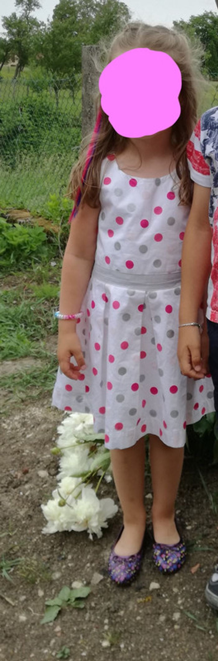 magnifique robe de cérémonie (mariage, anniversaire...) blanche à pois argenté, rose très bon état