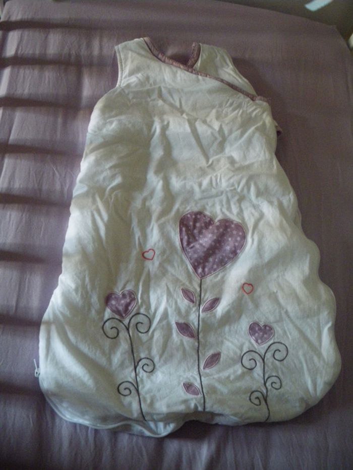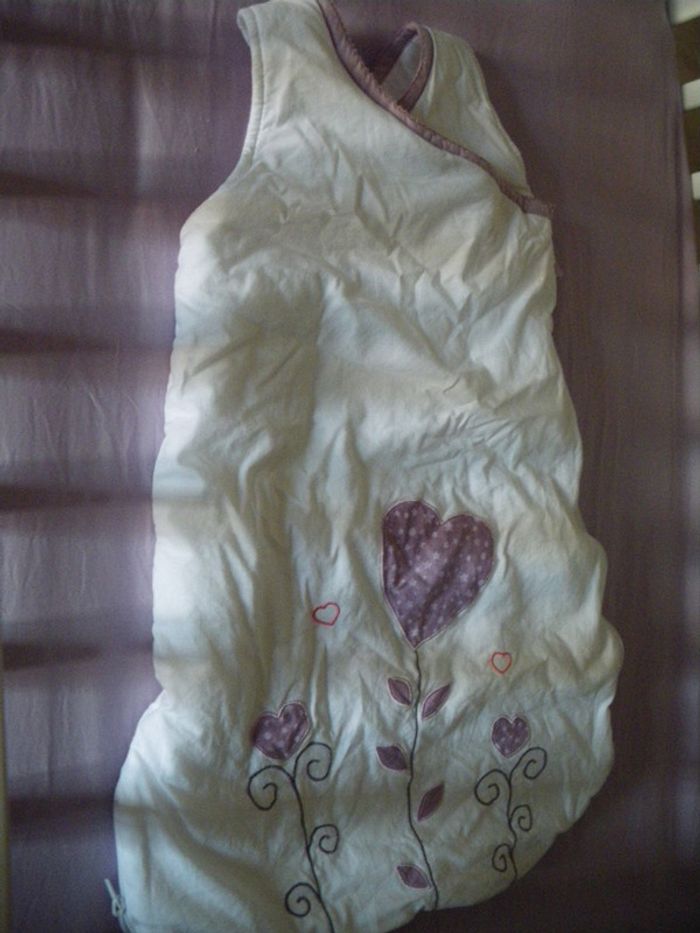 gigoteuse blanc et parme avec pressions transversales, 0-6 mois en très bon état et pressions arrières pour raccourcir la gigoteuse ++++ évolutive en 12 mois +++++ lessive bébé habitation non fumeurs 1ère main !