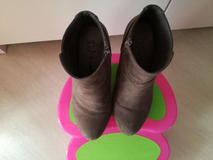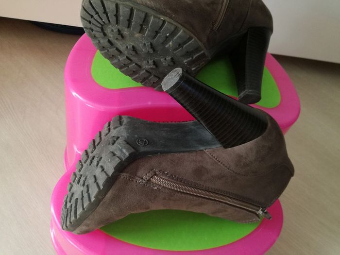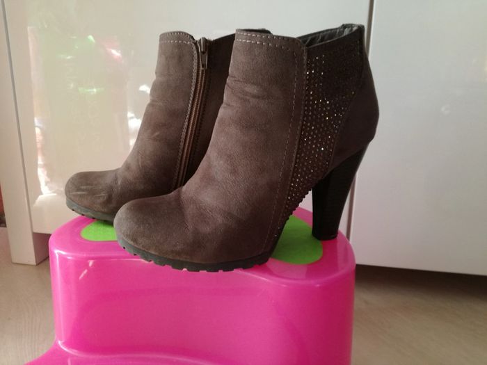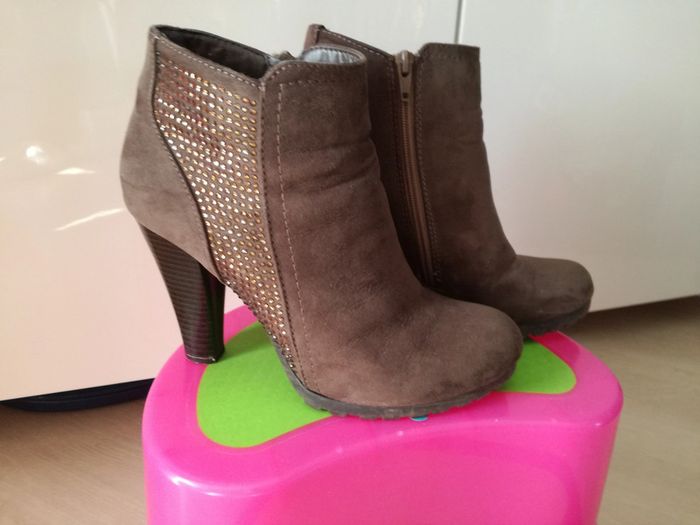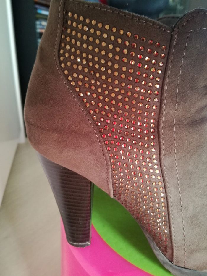 Bottines très peu mises car hautes pour moi elles sont très jolies portées. Hauteur talon 10'5cm Strass marron brillant
