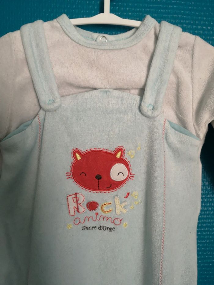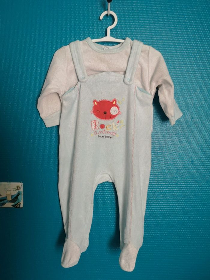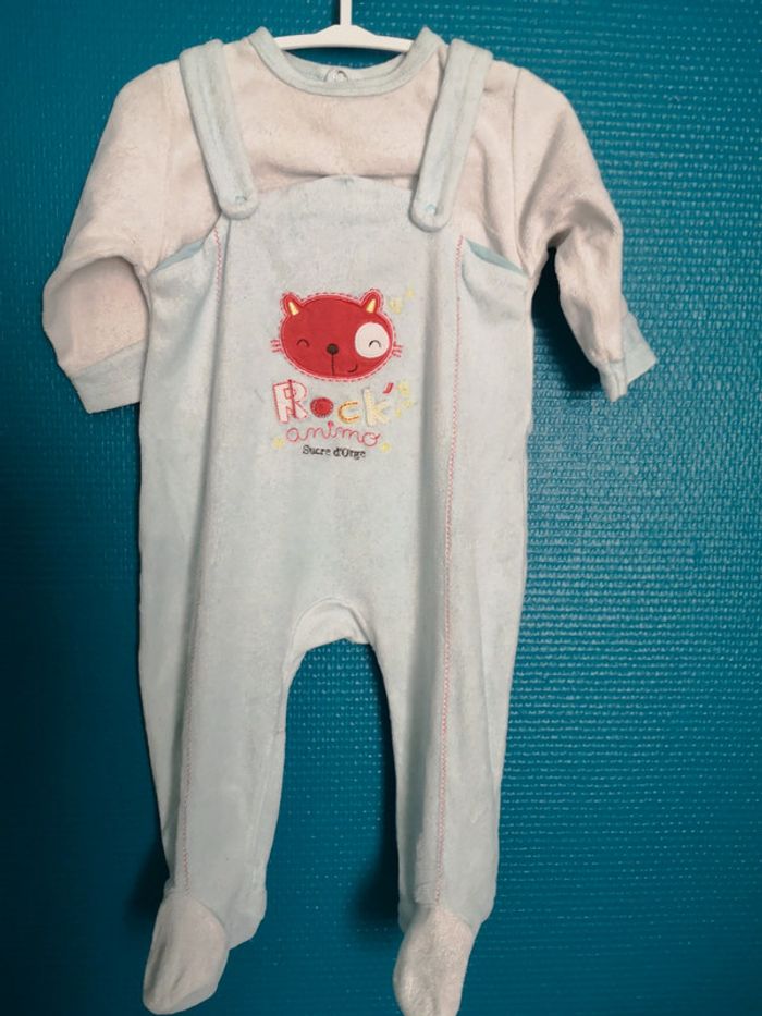 Très beau pyjama bleu et blanc de la marque Sucre D Orge 9 mois Très bon état aucune tâche lessive non industrielle non fumeur pas d'animaux
