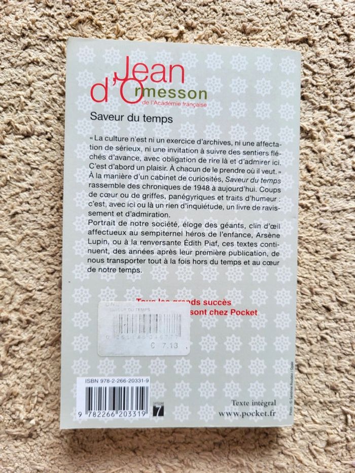 ⭐️ Nombreux livres dans mon dressing réductions sur les lots activées ✨️ 📚 Livre de l'academicien Jean D'Ormesson "Saveur du temps" 📖 Très bon état 📍Parfait pour les amateurs de belles lettres, d’humanisme et de réflexion sur la culture. 📕 Dans « Saveur du temps », Jean d’Ormesson partage ses réflexions sur la littérature, la philosophie, le temps qui passe, et les grandes figures qui l’ont marqué. Un recueil de textes brillants et accessibles, entre essai et confidence, porté par une plume pleine d’esprit et d’érudition.