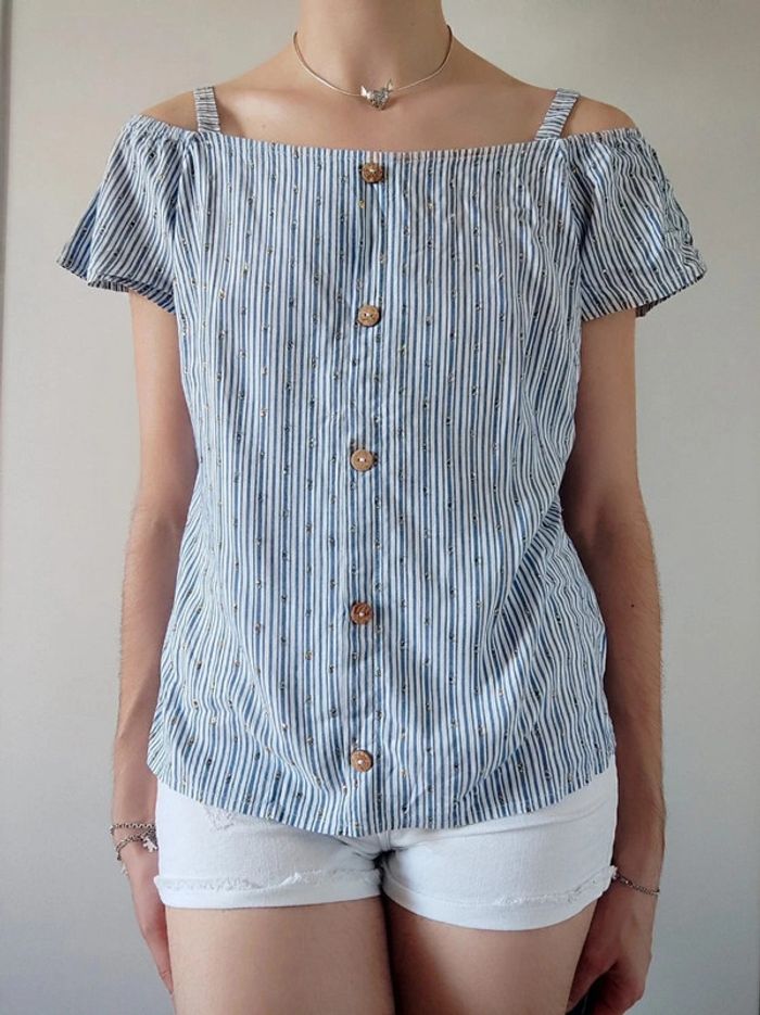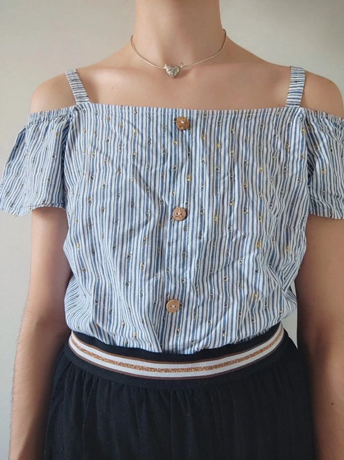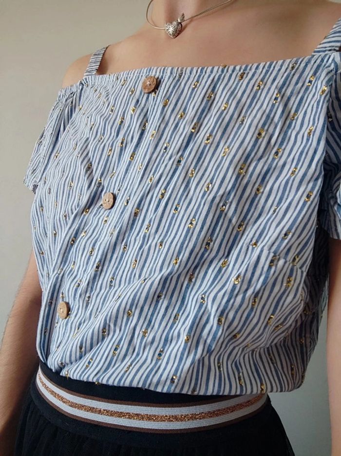 Top épaule dénudé rayé blanc bleu doré / Grain de Malice - 38/M à 40/L - photo numéro 11