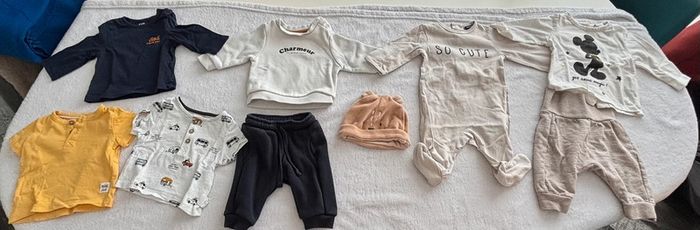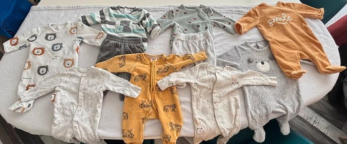 Bonjour, vends gros lot taille 1 mois garçon : avec : - 2 tee shirt manches courtes marque kiabi, - 2 tee shirt manches longues (1 kiabi, et 1 Disney), - 1 pull marque kiabi, - 1 bas de jogging marque kiabi, - 1 legging marque h&m - 1 petit bonnet, taille unique de Auchan, - 1 pyjama léger marque kiabi, - 2 pyjama léger marque primark, - 7 pyjamas une pièce marque kiabi, - 1 pyjama deux pièce marque kiabi, - 1 pyjama une pièce marque tape à l’œil, - 1 ensemble polaire de chez Intermarché, - 1 pyjama sans pied marque dim Et - 3 bodies manches longues marque kiabi.