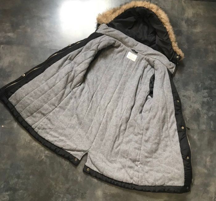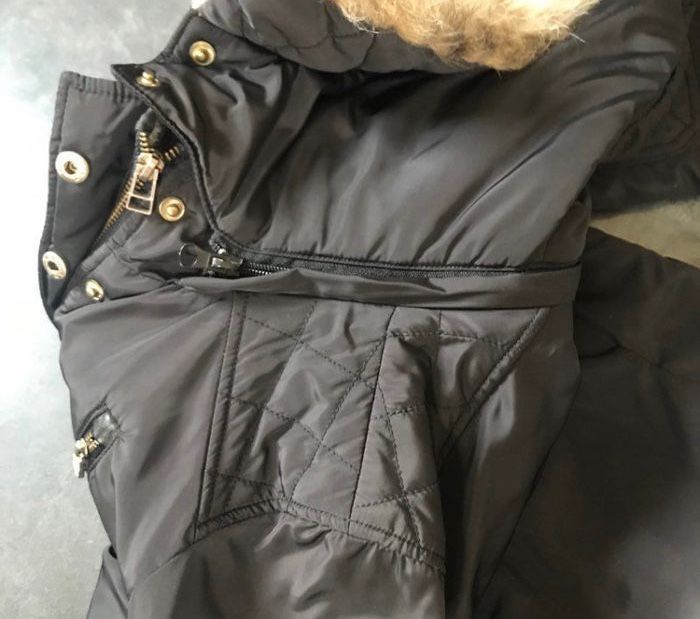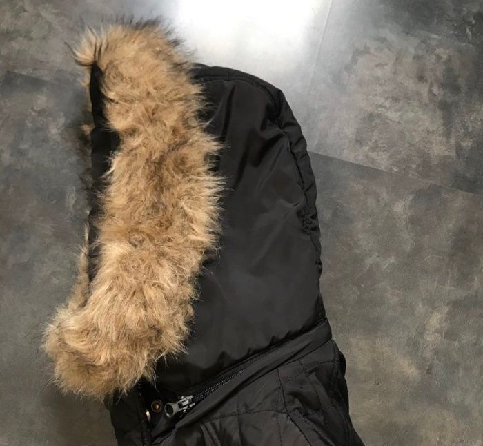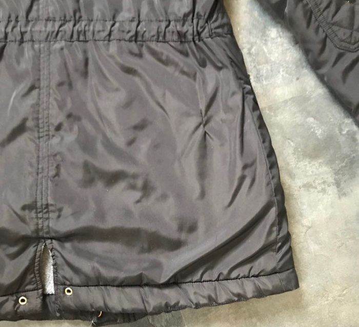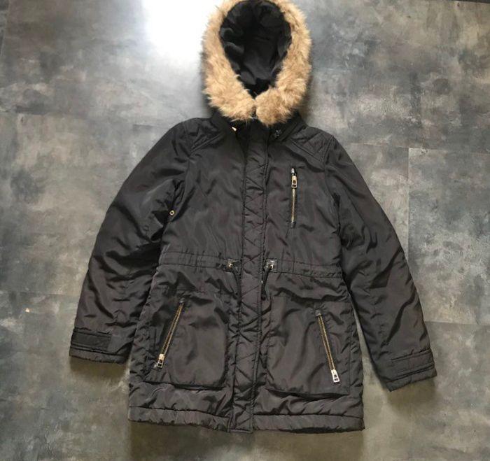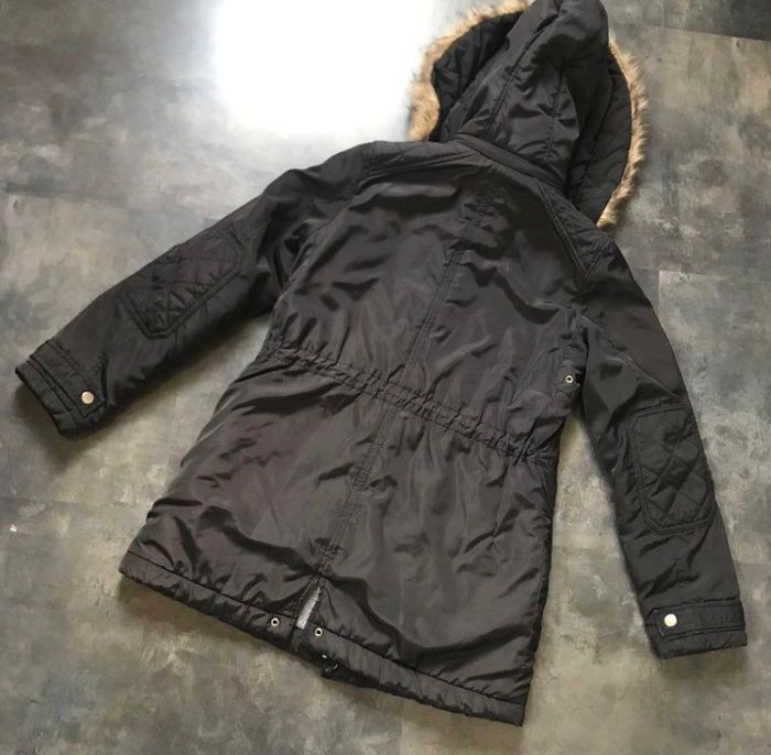 Manteau doudoune noir À capuche amovible Cordon à resserrer ou pas à la ceinture Bien chaud car doublé polaire gris , et longueur couvre les fesses À subi un petite réparation en bas du dos, voir photo Taille 11/12 ans 152 cm Zara girls