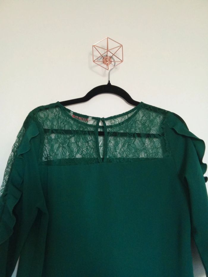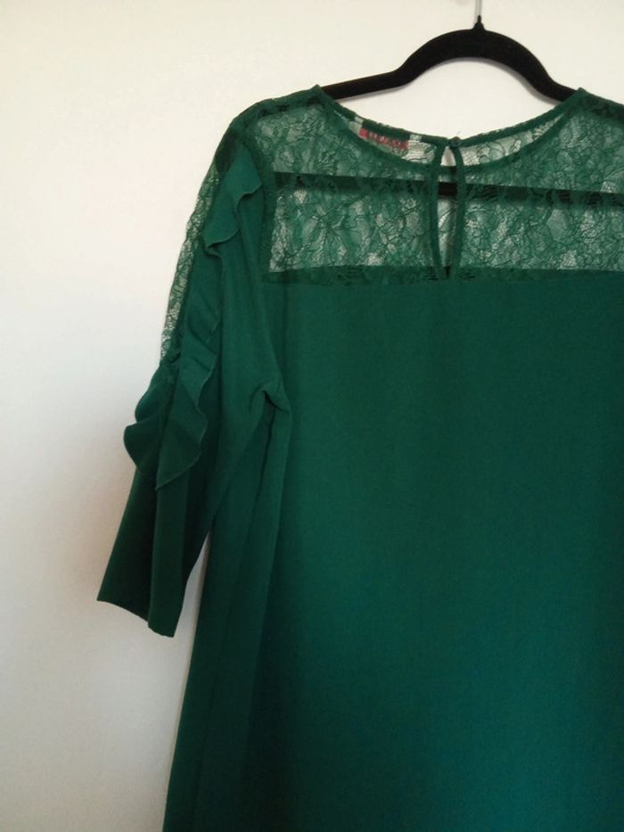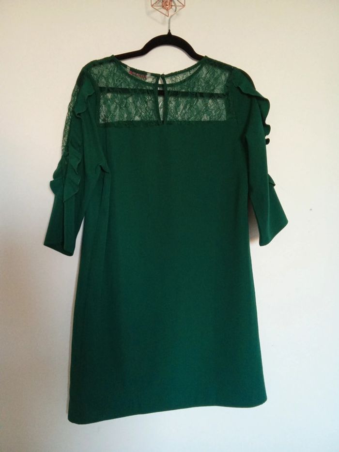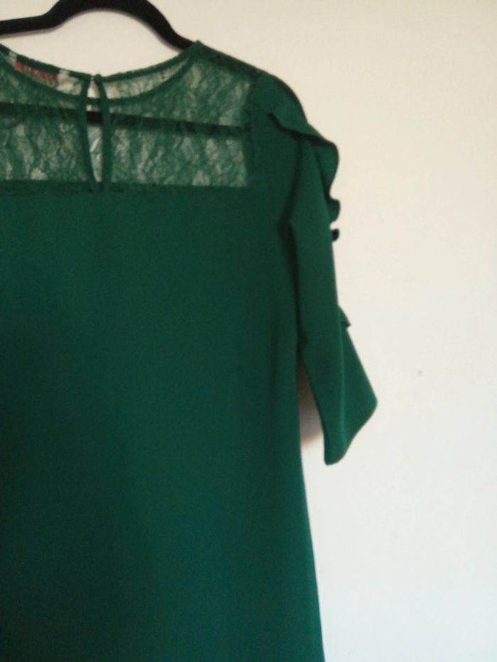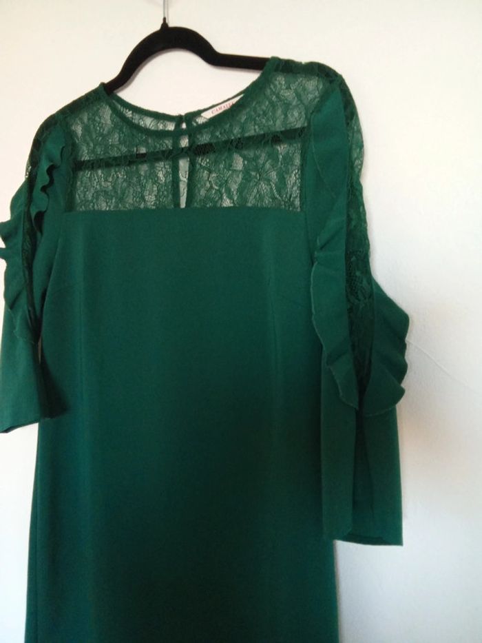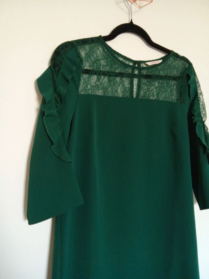 Robe taille 38 marque Camaïeu Robe à manche 3/4, coupe droite, dentelle au niveau du haut des épaules du décolleté et du haut du dos. Robe de couleur vert sapin #soya91_habitsfemme