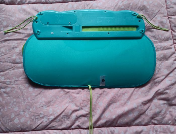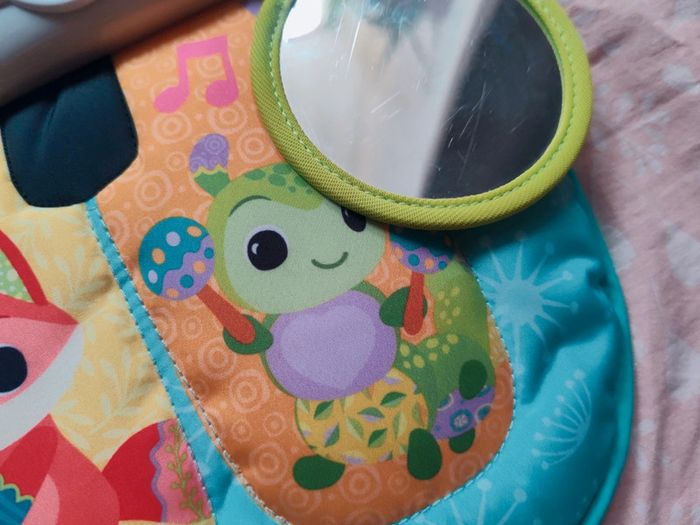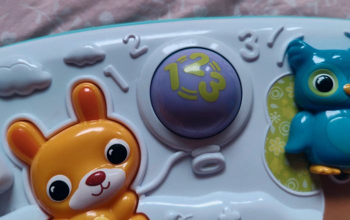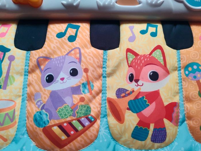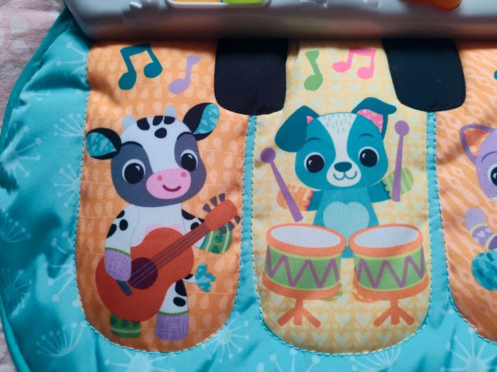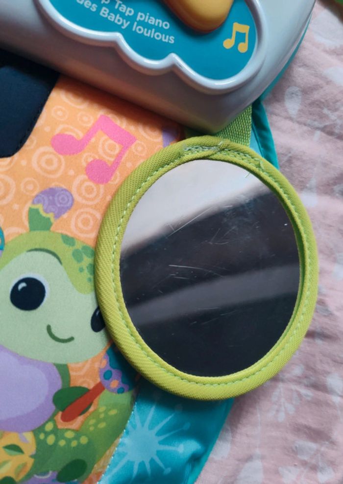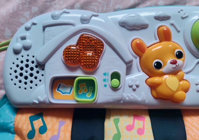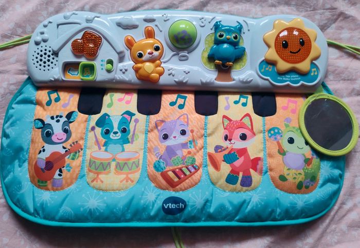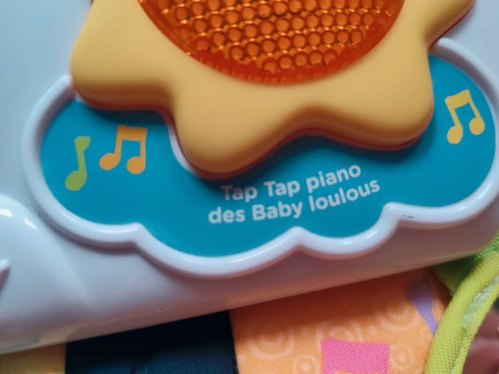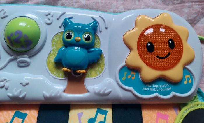 #amaandineeb_jouets Piano 🎹 avec une partie en tissu et une partie en plastique. Les touches sont situées sur la partie tissu avec un petit miroir ⚠️qui présente des rayures⚠️. Chaque touche fonctionne. Sur la partie en plastique divers éléments : la note de musique et le soleil s'illuminent. Le lapin 🐰 orange est fait pour appuyer dessus et déclencher des sons. La boule tourne. Le hibou 🦉 monte et descend et déclenche des sons. Idéal pour mettre dans un parc ou contre un meuble pour stimuler bébé a découvrir ses pieds et taper sur le piano a l'aide de ses pieds. Lorsqu'il est plus grand permet de découvrir les sons, les lumières etc... ⚠️Sur le dos du piano il y a une auréole qui est apparue lorsque j'ai voulu le nettoyer. Ne gêne en rien son utilisation. ⚠️ Fonctionne très bien. Attache et liens qui permettent d'accrocher le piano. VTech.