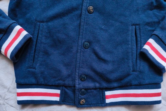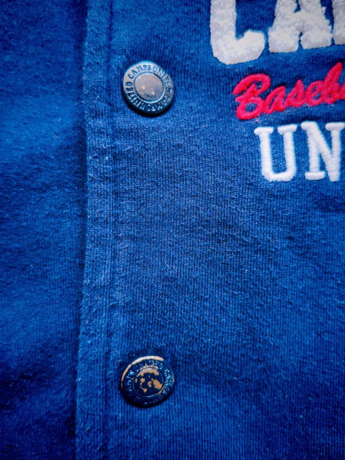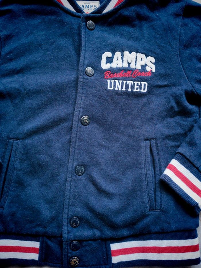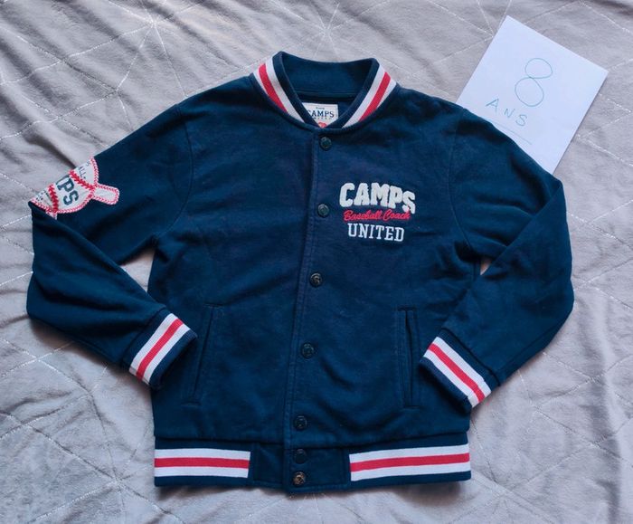 #amaandineebgarçon8ans Jolie veste esprit Teddy Baseball bleu marine avec bandes blanches et rouges au niveau du col, du bas des manches et du bas de la veste. "Camps United". Balle de baseball sur une des manches. Deux poches à l'avant. ⚠️Peinture des boutons un peu écaillée sur certains des boutons (voir photos). ⚠️ Très bon état malgré cela. Sans tâches ni trous. Camps United by Gémo. 8 ans.
