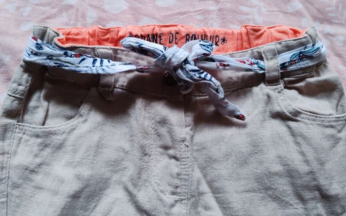 #amaandineeb_bebefille18mois Joli pantalon beige léger type lin avec petite ceinture en tissu. Possibilité de relever les jambes ou non grâce aux pressions sur les côtés (voir photo). ⚠️Un passant de ceinture est décousu simple de le recoudre si vous êtes un brin couturière⚠️. Très bon état. Sans tâches ni trous. Graine de bonheur by Gémo. 18 mois.