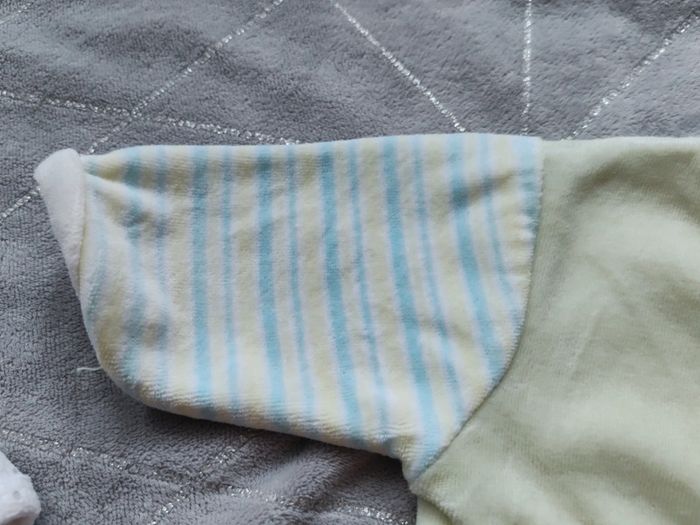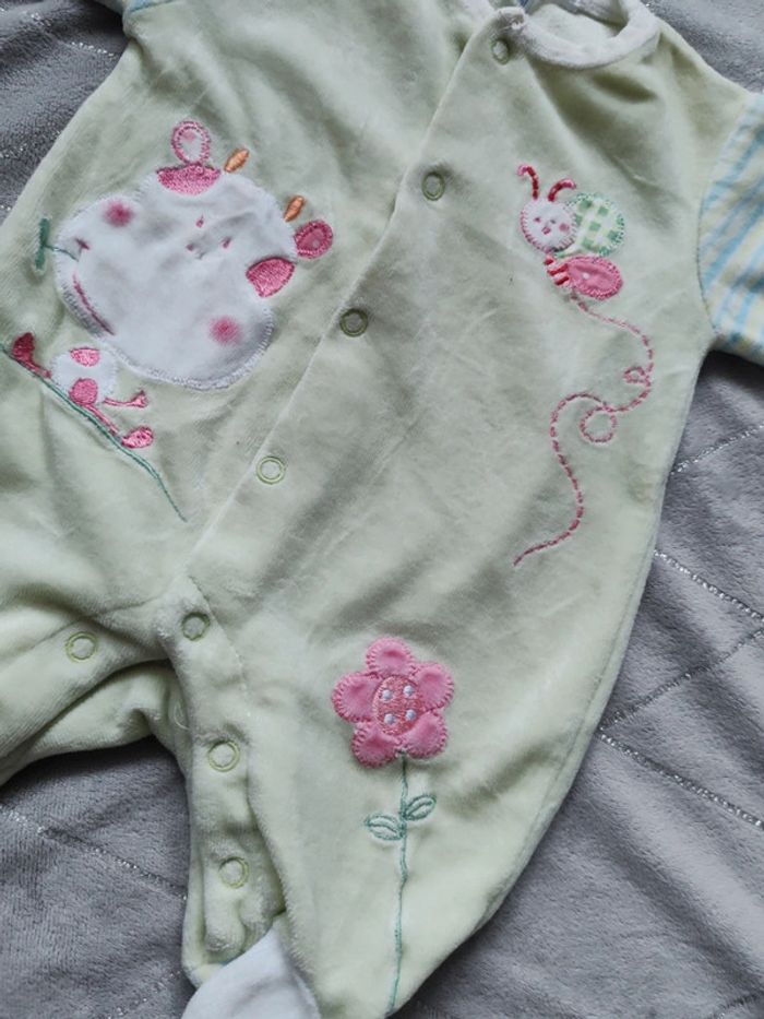 #amaandineeb_bebefille0mois Joli petit pyjama vert pomme avec petits dessins roses et blancs. Manches rayées. Pressions sur le devant. Très bon état. Sans tâches ni trous. Kitchoun. 0 mois - 50 cm.
